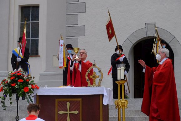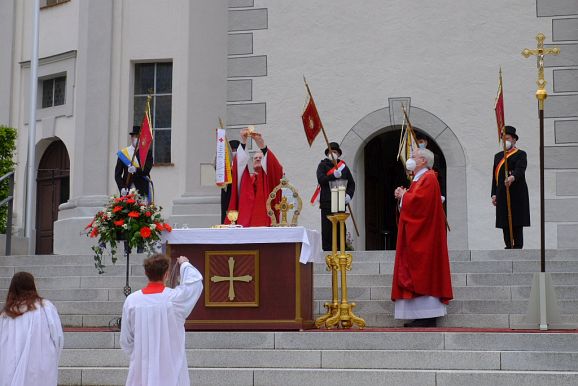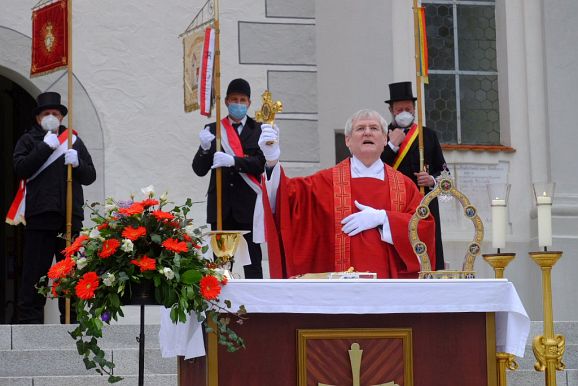 Bad Wurzach - Mit einem Open-Air Gottesdienst feierte der Wallfahrtsausschuss und die Seelsorgeeinheit Bad Wurzach gemeinsam mit rund 150 Vertretern der Blutreitergruppen am Pfingstmontag den Auftakt der Heiligblutfestfeierlichkeiten.
