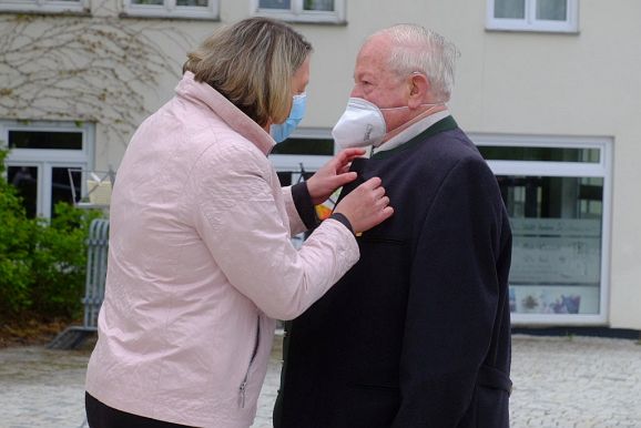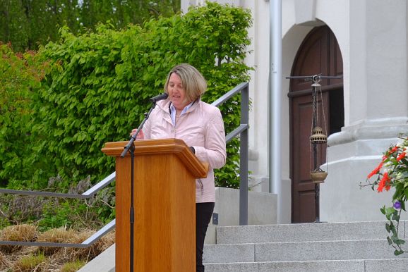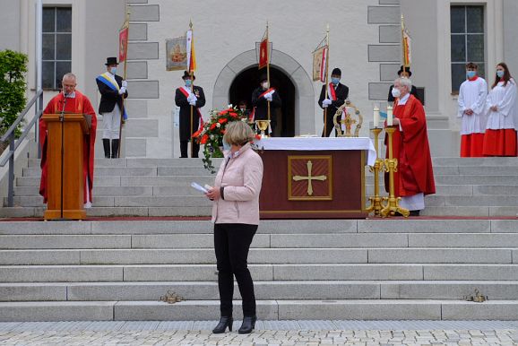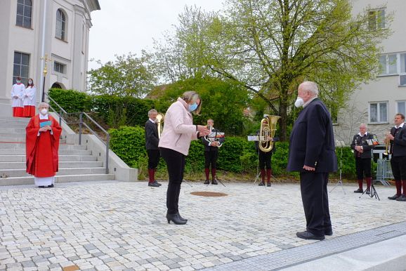 Ehrungen verdienter Blutreiter waren wegen der erneut nicht durchführbaren Gruppenführerversammlung nicht vorgesehen. Dennoch gab es in diesem Jahr eine ganz besondere Ehrung durch Bürgermeisterin Alexandra Scherer, von Amts wegen Vorsitzende des Wallfahrtsausschusses.