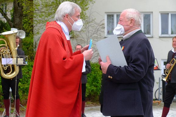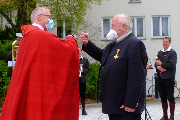 Für seine überragenden Verdienste um das Fest bekam Fimpel von der Bürgermeisterin die goldene Medaille angeheftet, während Stadtpfarrer Maier die Urkunde und Superior Pater Konrad ein Geschenk überreichte.