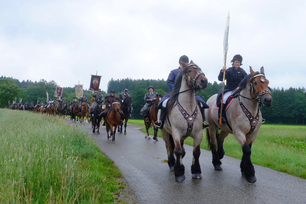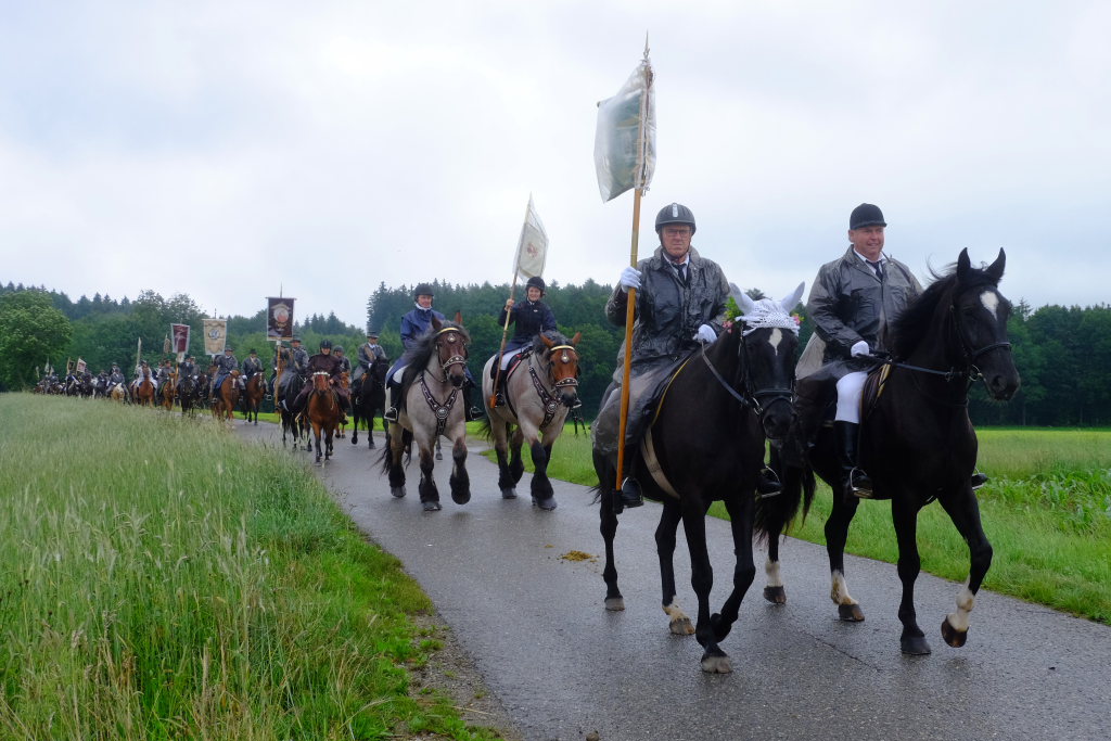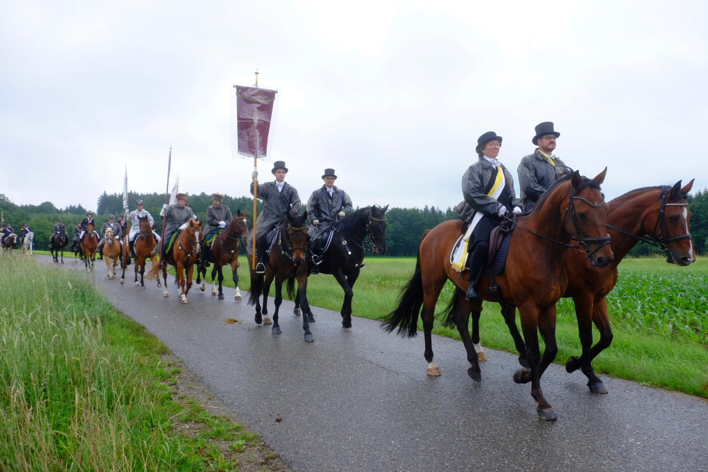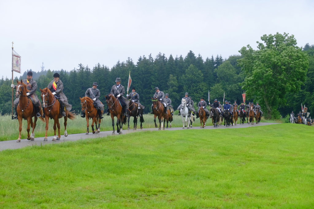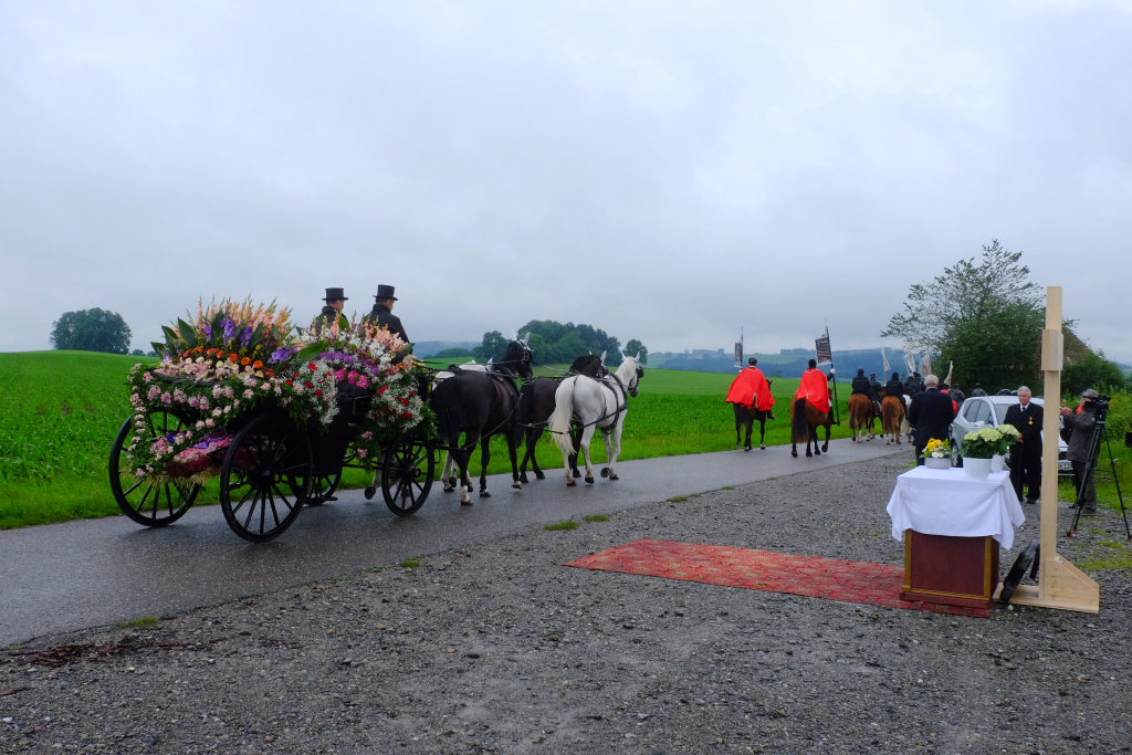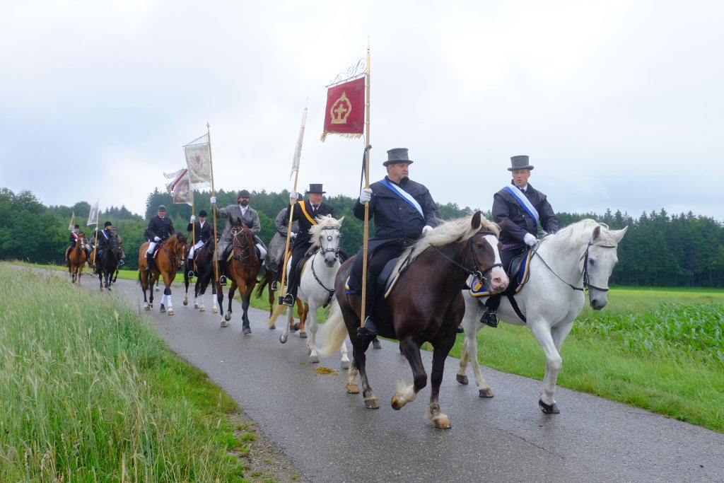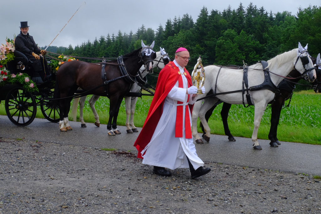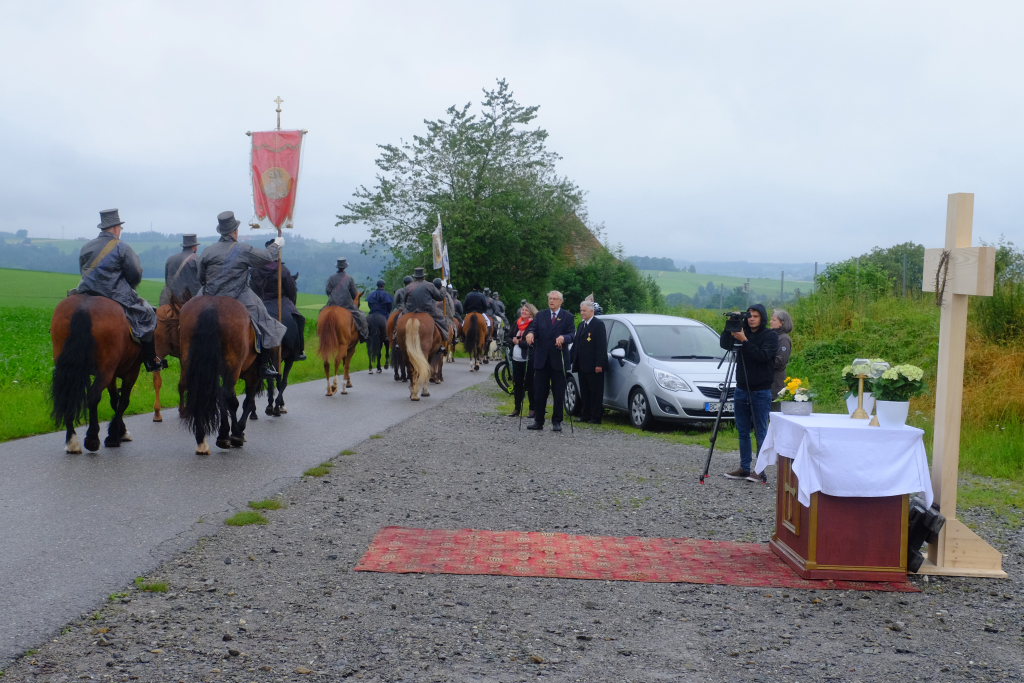 Beim Schützenhaus am Maxhof war ein Stationsaltar aufgebaut, zu dem auch Josef Burhardt, langjähriger Organisationsleiter der Bad Wurzacher Wallfahrtskommission, Bürgermeister Alexandra Scherer sowie der langjährige Blasmusikkreisverbandsvorsitzende und gern gesehene Ehrengast beim Heilig-Blut-Fest, Josef Mütz, hinaufgepilgert waren. Nach einer Lesung und einer Segenspendung durch den Weihbischof näherte sich die rund 100 Reiter umfassende Prozession wieder den altgewohnten Gefilden beim Gottesberg. Mit ihren Standarten und Fahnen gaben sie auch auf den neuen Wegen ein eindrucksvolles Bild ab und verbreiteten damit vielleicht sogar eine noch feierlichere Atmosphäre als sonst.