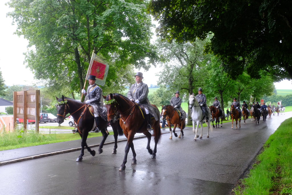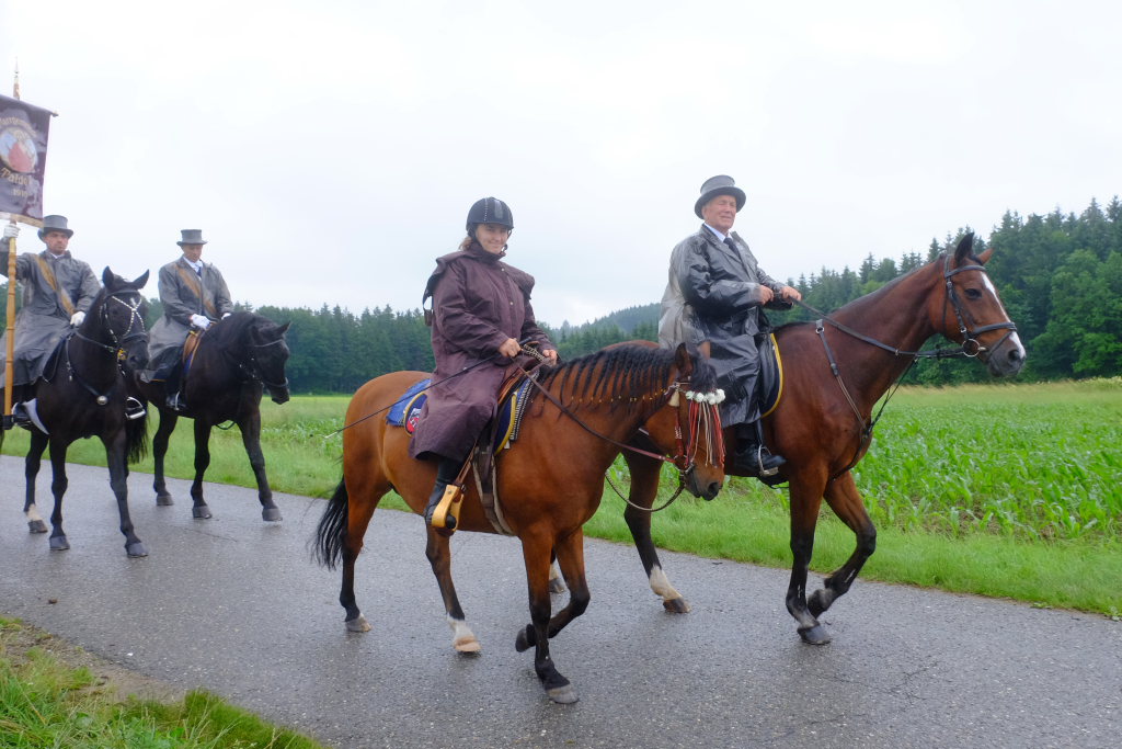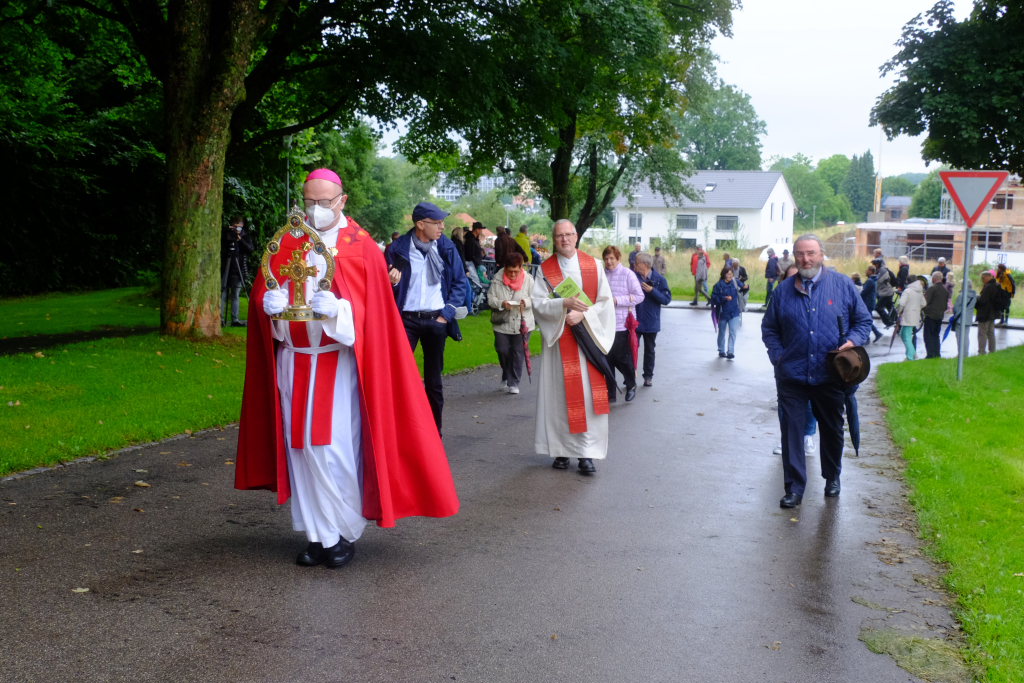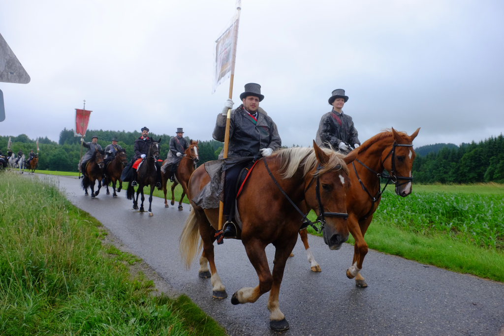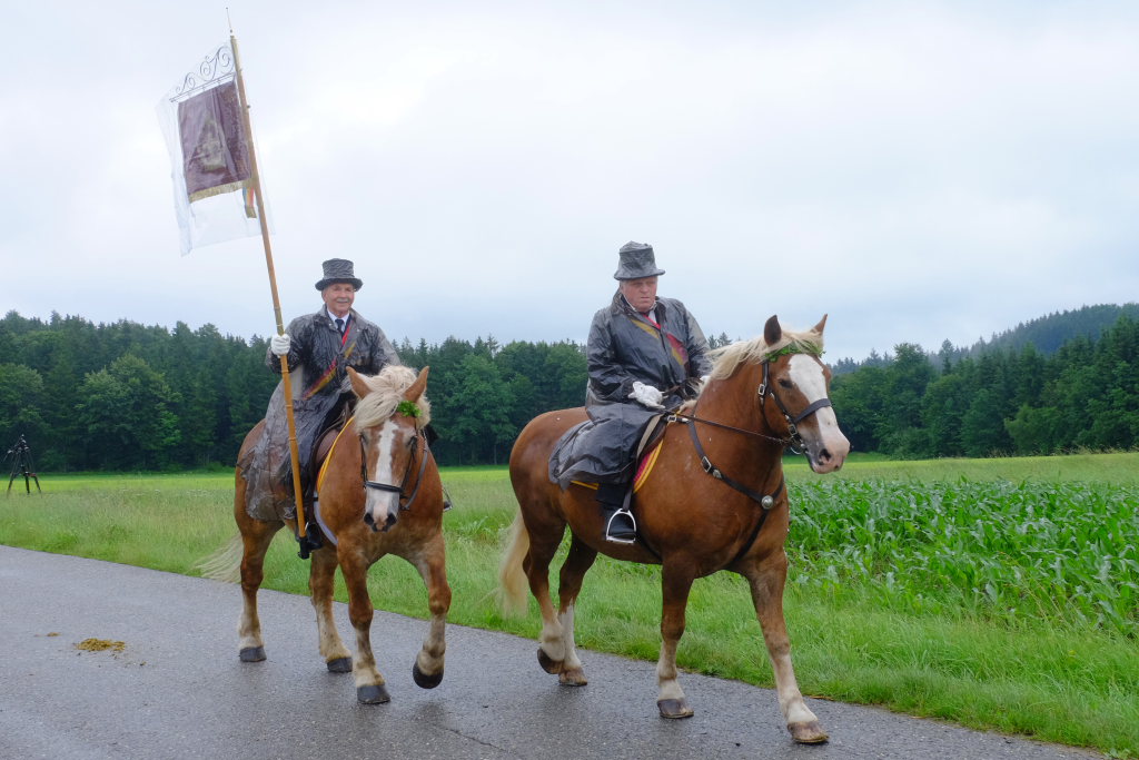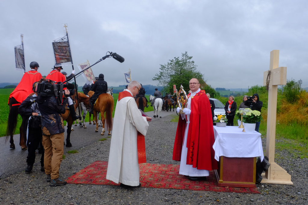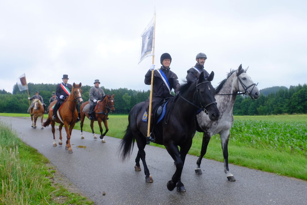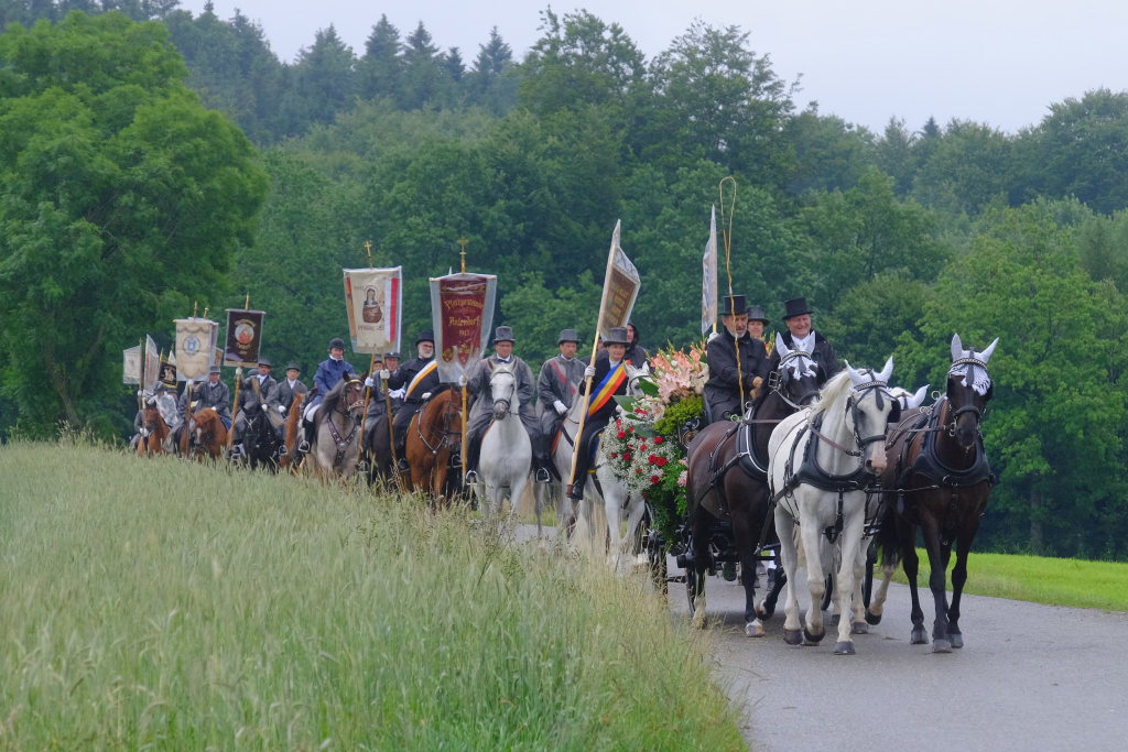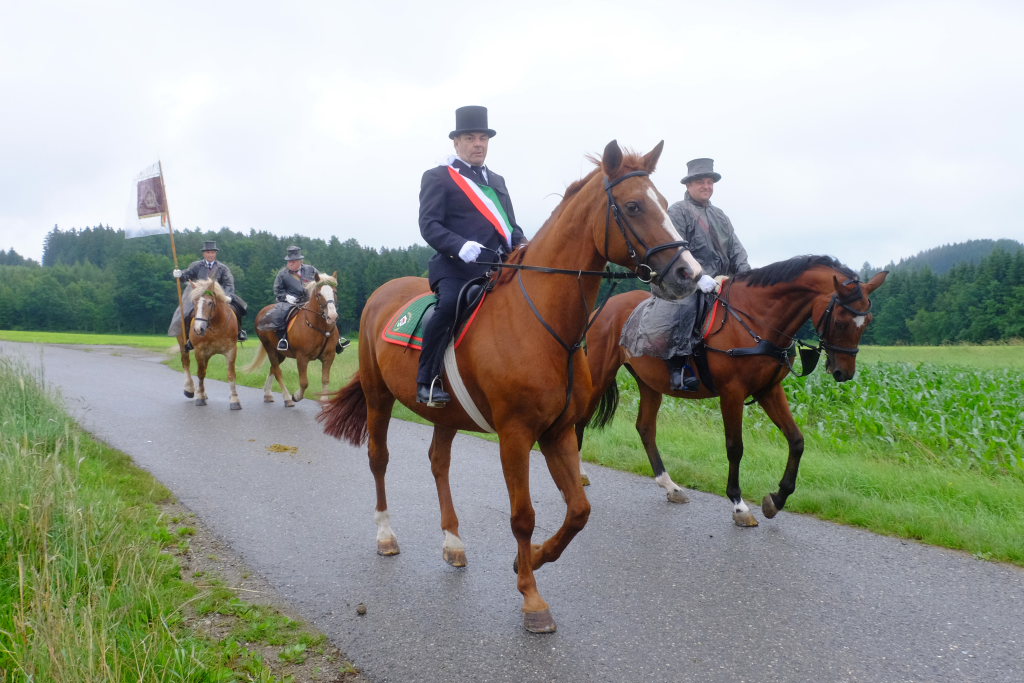 Beim Schützenhaus am Maxhof war ein Stationsaltar aufgebaut, zu dem auch Josef Burhardt, langjähriger Organisationsleiter der Bad Wurzacher Wallfahrtskommission, Bürgermeister Alexandra Scherer sowie der langjährige Blasmusikkreisverbandsvorsitzende und gern gesehene Ehrengast beim Heilig-Blut-Fest, Josef Mütz, hinaufgepilgert waren. Nach einer Lesung und einer Segenspendung durch den Weihbischof näherte sich die rund 100 Reiter umfassende Prozession wieder den altgewohnten Gefilden beim Gottesberg. Mit ihren Standarten und Fahnen gaben sie auch auf den neuen Wegen ein eindrucksvolles Bild ab und verbreiteten damit vielleicht sogar eine noch feierlichere Atmosphäre als sonst.
