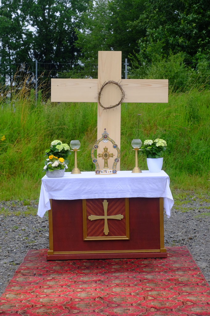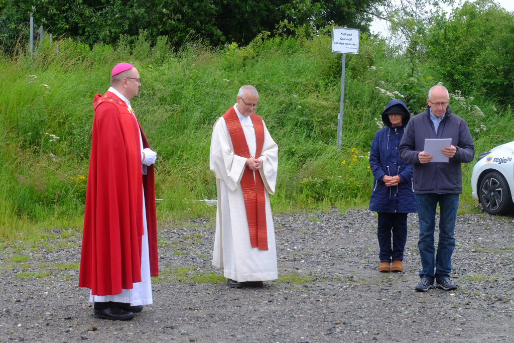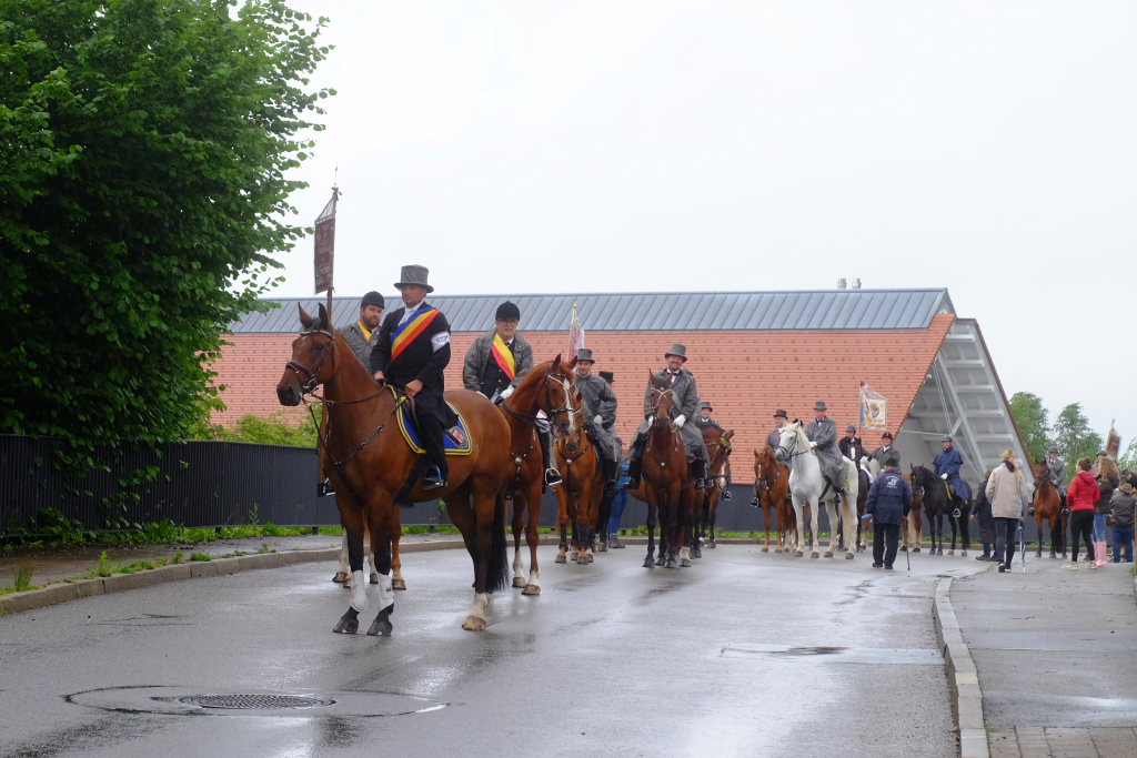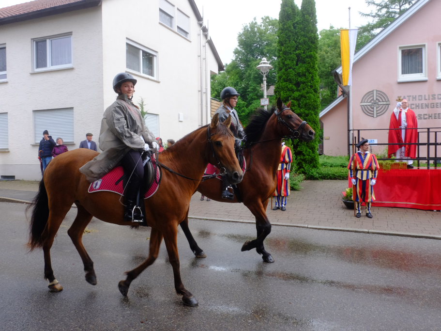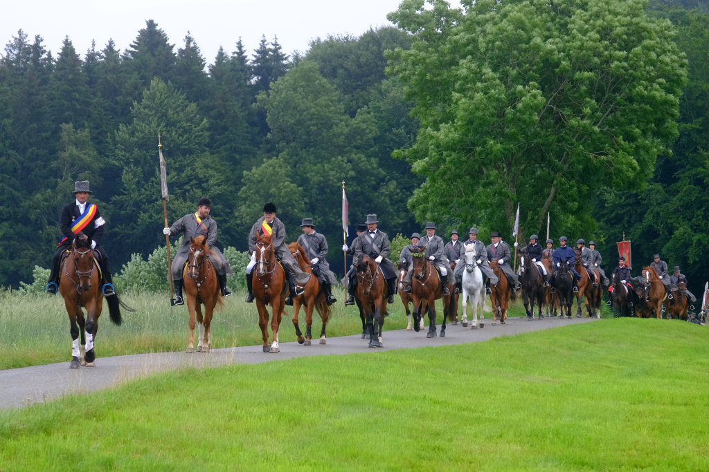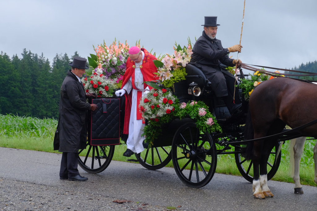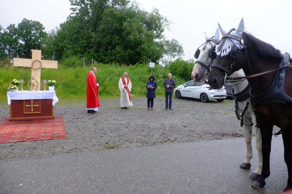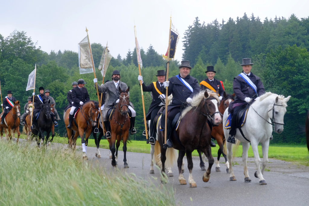 Beim Schützenhaus am Maxhof war ein Stationsaltar aufgebaut, zu dem auch Josef Burhardt, langjähriger Organisationsleiter der Bad Wurzacher Wallfahrtskommission, Bürgermeister Alexandra Scherer sowie der langjährige Blasmusikkreisverbandsvorsitzende und gern gesehene Ehrengast beim Heilig-Blut-Fest, Josef Mütz, hinaufgepilgert waren. Nach einer Lesung und einer Segenspendung durch den Weihbischof näherte sich die rund 100 Reiter umfassende Prozession wieder den altgewohnten Gefilden beim Gottesberg. Mit ihren Standarten und Fahnen gaben sie auch auf den neuen Wegen ein eindrucksvolles Bild ab und verbreiteten damit vielleicht sogar eine noch feierlichere Atmosphäre als sonst.