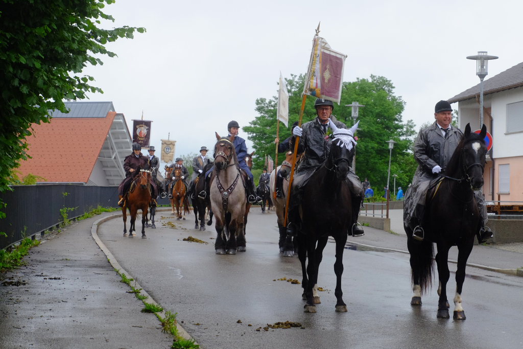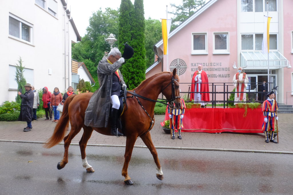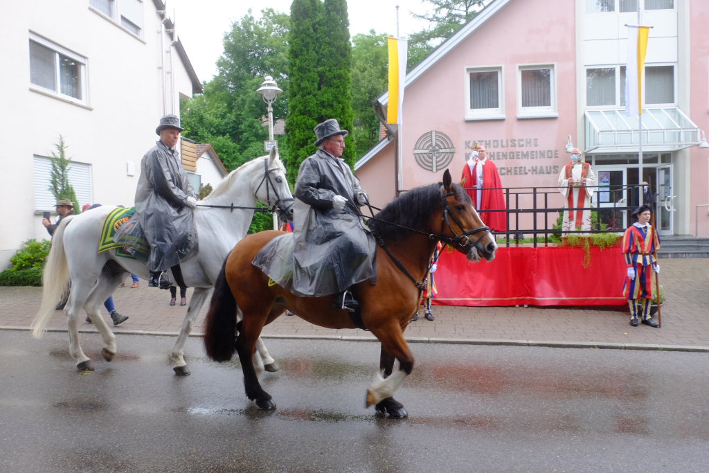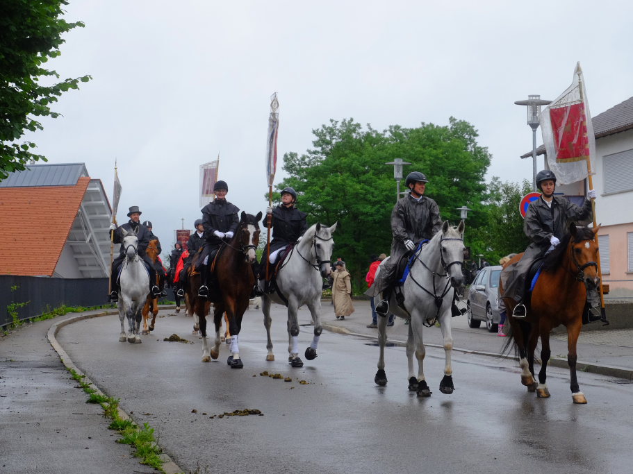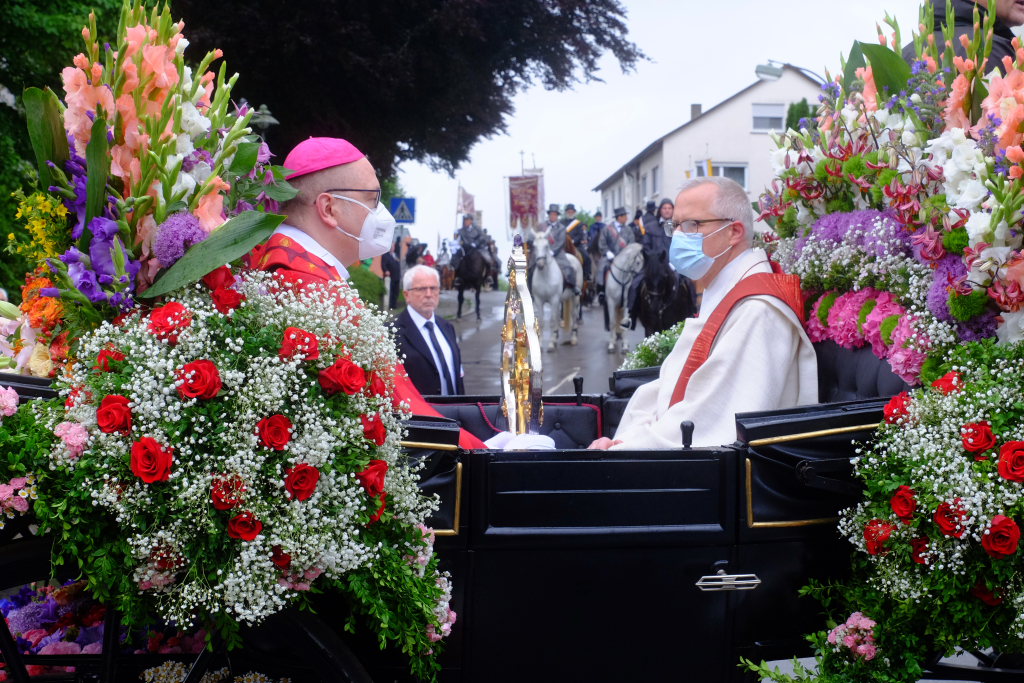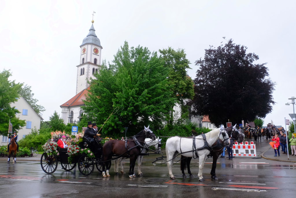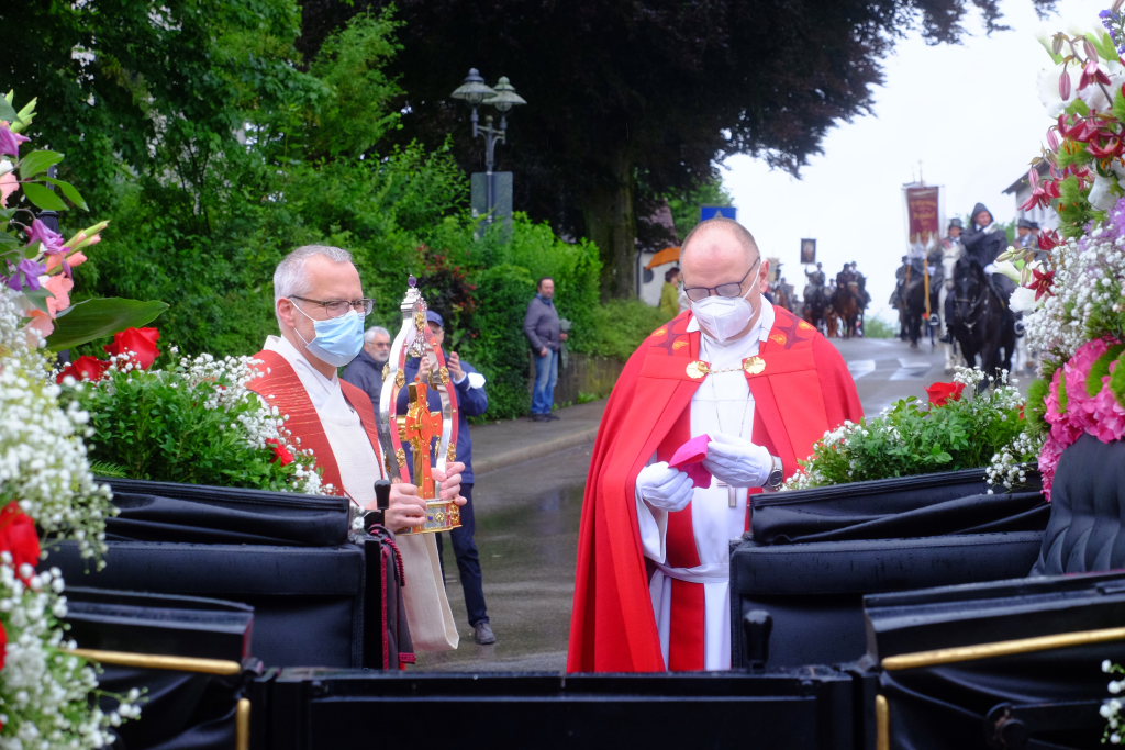 Nach dem im Vorjahr an diesem höchsten Wurzacher kirchlichen Feiertag nur eine „Überführungsfahrt“ vom Gottesberg nach St. Verena in Begleitung von vier Reitern möglich gewesen war, konnte sich in diesem Jahr jede Blutreitergruppe, die sonst mit zahlreichen Reitern teilnahm, sich mit zwei Reitern an der Prozession beteiligen. Um die Corona-Bestimmungen einhalten zu können, wurde von der Wallfahrtskommission für dieses Jahr ein neuer Prozessionsweg festgelegt, der den Reitern erst am Freitagmorgen am Startpunkt beim Pius-Scheel-Haus bekanntgegeben wurde. Dort empfing unter den Klängen der Stadtkapelle die erste Abteilung der Reiter, die sich in der Kirchbühlstraße für die Prozession versammelt hatten, von Weihbischof Gerhard Schneider den Segen. Über die Memminger Straße und den Salvatorhof in Wiesen führte der Weg den Heilig-Blut-Wagen mit der Reliquie die Straße hinauf Richtung Wengenreute, wo auf der Anhöhe beim Flurkreuz zwischen den beiden Birken die erste Gebetsstation an dem rund fünf Kilometer langen Prozessionsweg auf die Reiter wartete.