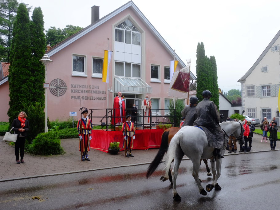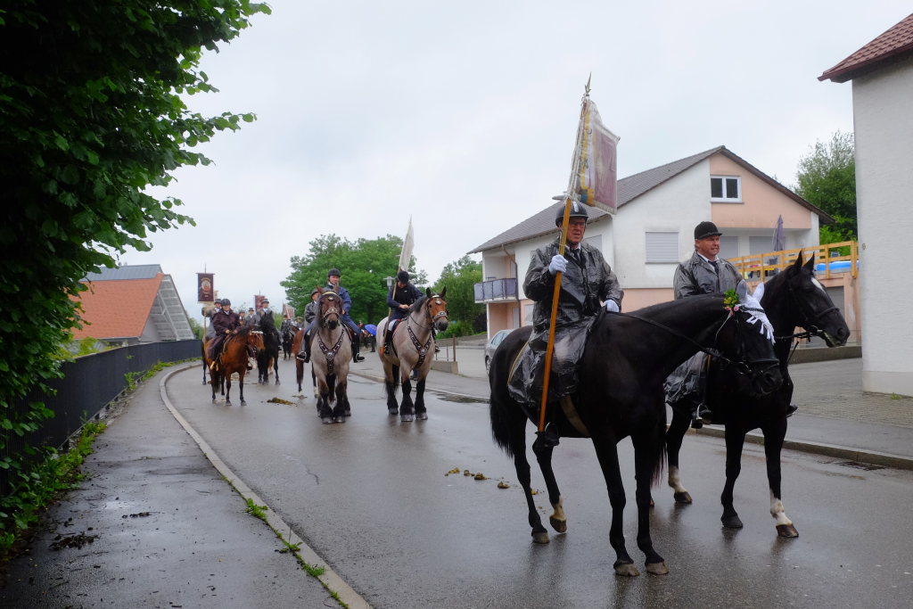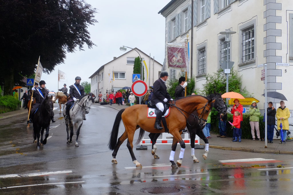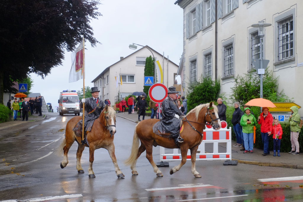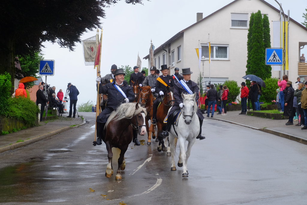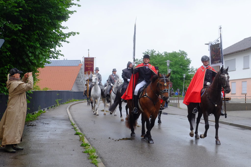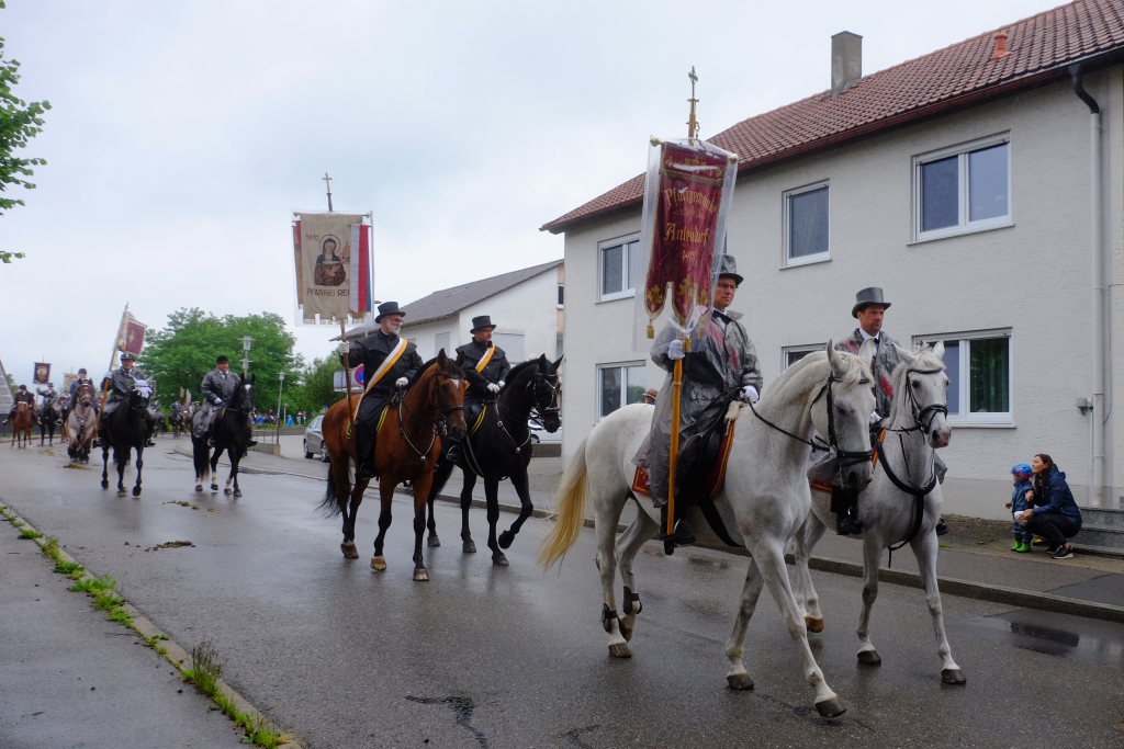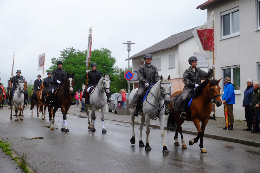 Nach dem im Vorjahr an diesem höchsten Wurzacher kirchlichen Feiertag nur eine „Überführungsfahrt“ vom Gottesberg nach St. Verena in Begleitung von vier Reitern möglich gewesen war, konnte sich in diesem Jahr jede Blutreitergruppe, die sonst mit zahlreichen Reitern teilnahm, sich mit zwei Reitern an der Prozession beteiligen. Um die Corona-Bestimmungen einhalten zu können, wurde von der Wallfahrtskommission für dieses Jahr ein neuer Prozessionsweg festgelegt, der den Reitern erst am Freitagmorgen am Startpunkt beim Pius-Scheel-Haus bekanntgegeben wurde. Dort empfing unter den Klängen der Stadtkapelle die erste Abteilung der Reiter, die sich in der Kirchbühlstraße für die Prozession versammelt hatten, von Weihbischof Gerhard Schneider den Segen. Über die Memminger Straße und den Salvatorhof in Wiesen führte der Weg den Heilig-Blut-Wagen mit der Reliquie die Straße hinauf Richtung Wengenreute, wo auf der Anhöhe beim Flurkreuz zwischen den beiden Birken die erste Gebetsstation an dem rund fünf Kilometer langen Prozessionsweg auf die Reiter wartete.