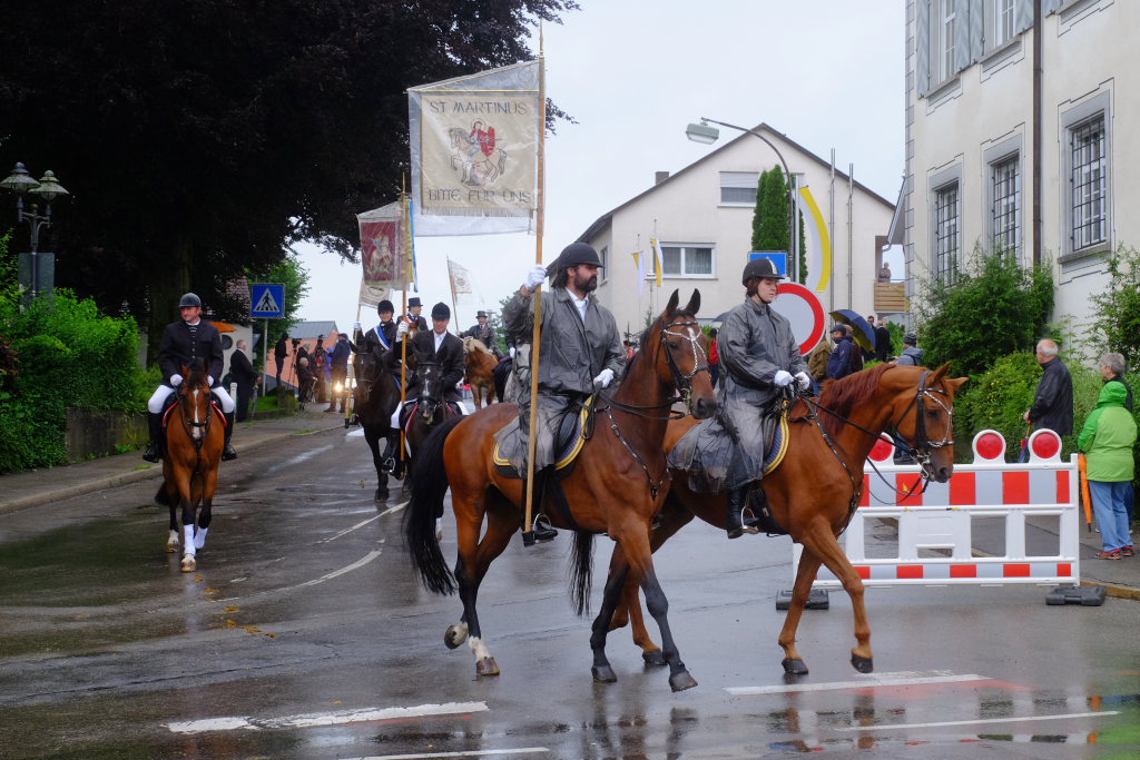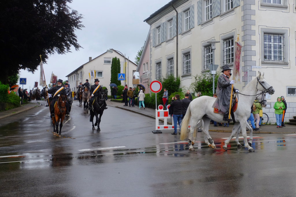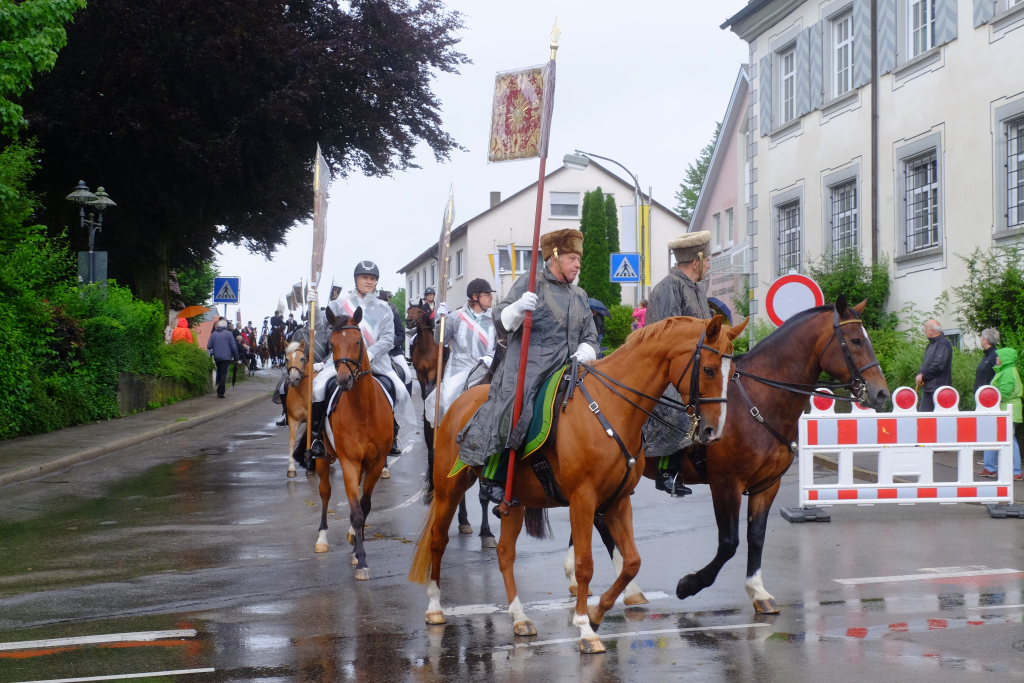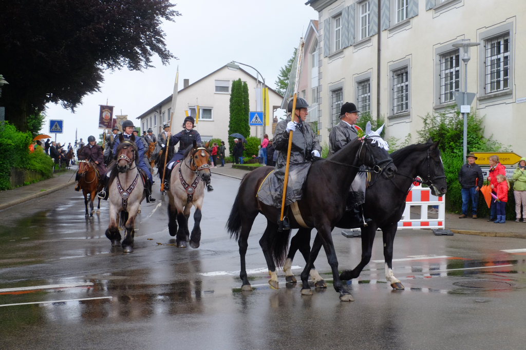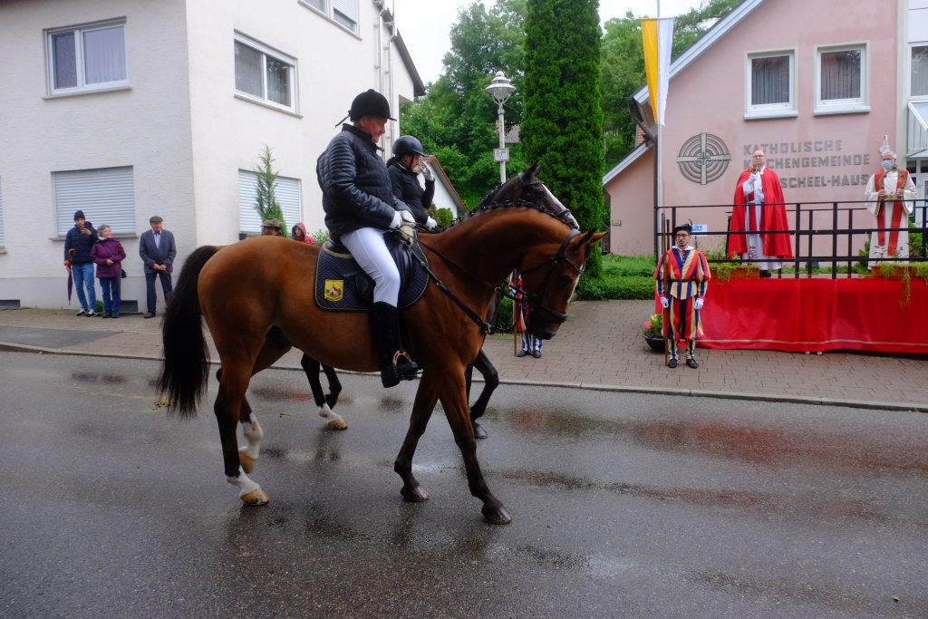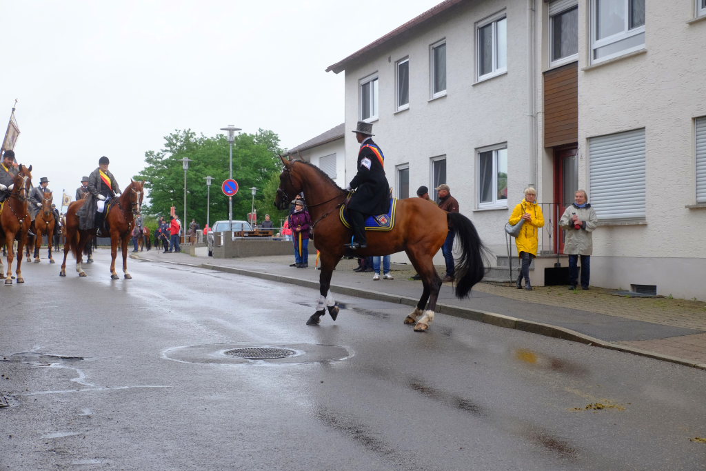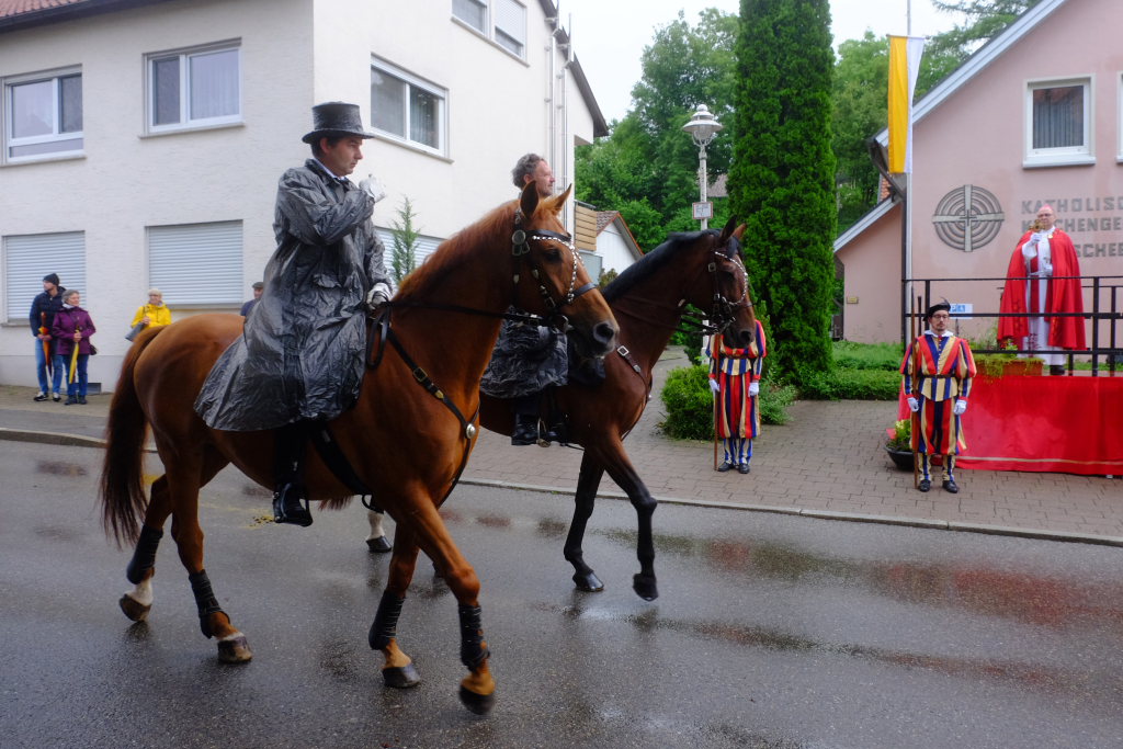 Nach dem im Vorjahr an diesem höchsten Wurzacher kirchlichen Feiertag nur eine „Überführungsfahrt“ vom Gottesberg nach St. Verena in Begleitung von vier Reitern möglich gewesen war, konnte sich in diesem Jahr jede Blutreitergruppe, die sonst mit zahlreichen Reitern teilnahm, sich mit zwei Reitern an der Prozession beteiligen. Um die Corona-Bestimmungen einhalten zu können, wurde von der Wallfahrtskommission für dieses Jahr ein neuer Prozessionsweg festgelegt, der den Reitern erst am Freitagmorgen am Startpunkt beim Pius-Scheel-Haus bekanntgegeben wurde. Dort empfing unter den Klängen der Stadtkapelle die erste Abteilung der Reiter, die sich in der Kirchbühlstraße für die Prozession versammelt hatten, von Weihbischof Gerhard Schneider den Segen. Über die Memminger Straße und den Salvatorhof in Wiesen führte der Weg den Heilig-Blut-Wagen mit der Reliquie die Straße hinauf Richtung Wengenreute, wo auf der Anhöhe beim Flurkreuz zwischen den beiden Birken die erste Gebetsstation an dem rund fünf Kilometer langen Prozessionsweg auf die Reiter wartete.
