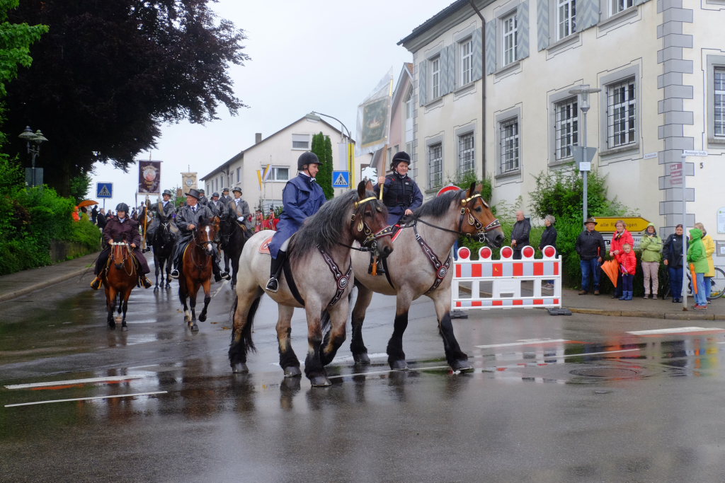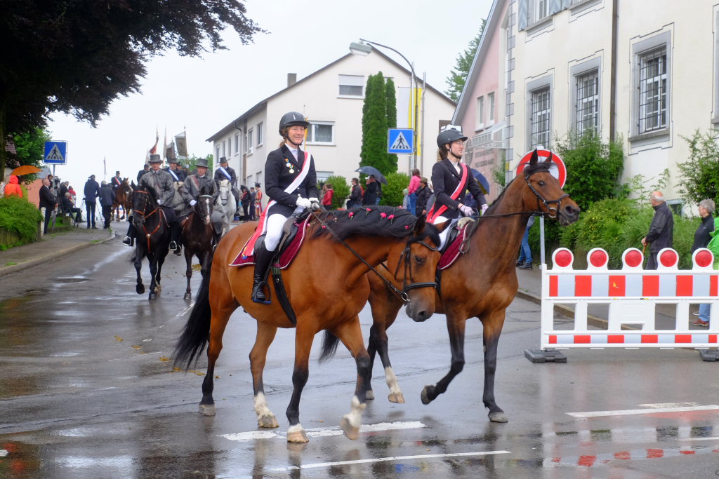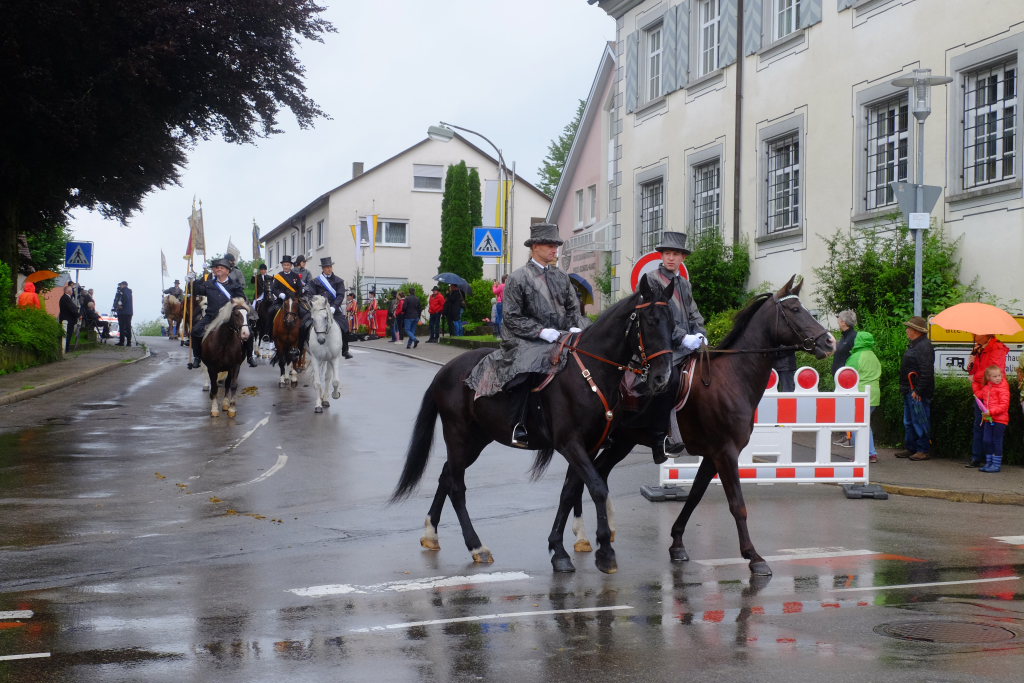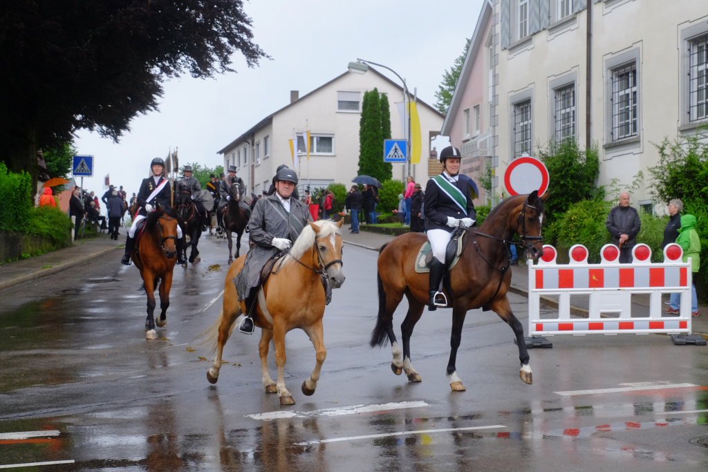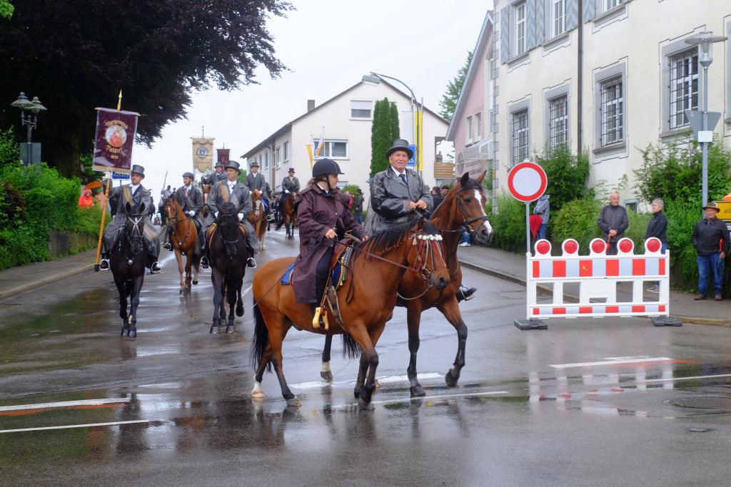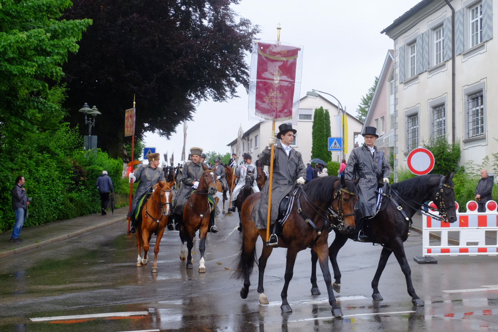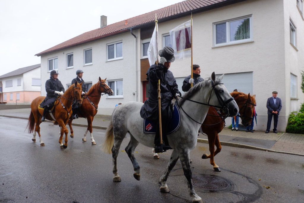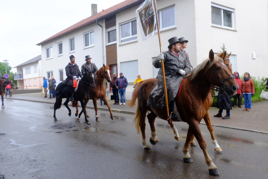 Nach dem im Vorjahr an diesem höchsten Wurzacher kirchlichen Feiertag nur eine „Überführungsfahrt“ vom Gottesberg nach St. Verena in Begleitung von vier Reitern möglich gewesen war, konnte sich in diesem Jahr jede Blutreitergruppe, die sonst mit zahlreichen Reitern teilnahm, sich mit zwei Reitern an der Prozession beteiligen. Um die Corona-Bestimmungen einhalten zu können, wurde von der Wallfahrtskommission für dieses Jahr ein neuer Prozessionsweg festgelegt, der den Reitern erst am Freitagmorgen am Startpunkt beim Pius-Scheel-Haus bekanntgegeben wurde. Dort empfing unter den Klängen der Stadtkapelle die erste Abteilung der Reiter, die sich in der Kirchbühlstraße für die Prozession versammelt hatten, von Weihbischof Gerhard Schneider den Segen. Über die Memminger Straße und den Salvatorhof in Wiesen führte der Weg den Heilig-Blut-Wagen mit der Reliquie die Straße hinauf Richtung Wengenreute, wo auf der Anhöhe beim Flurkreuz zwischen den beiden Birken die erste Gebetsstation an dem rund fünf Kilometer langen Prozessionsweg auf die Reiter wartete.
