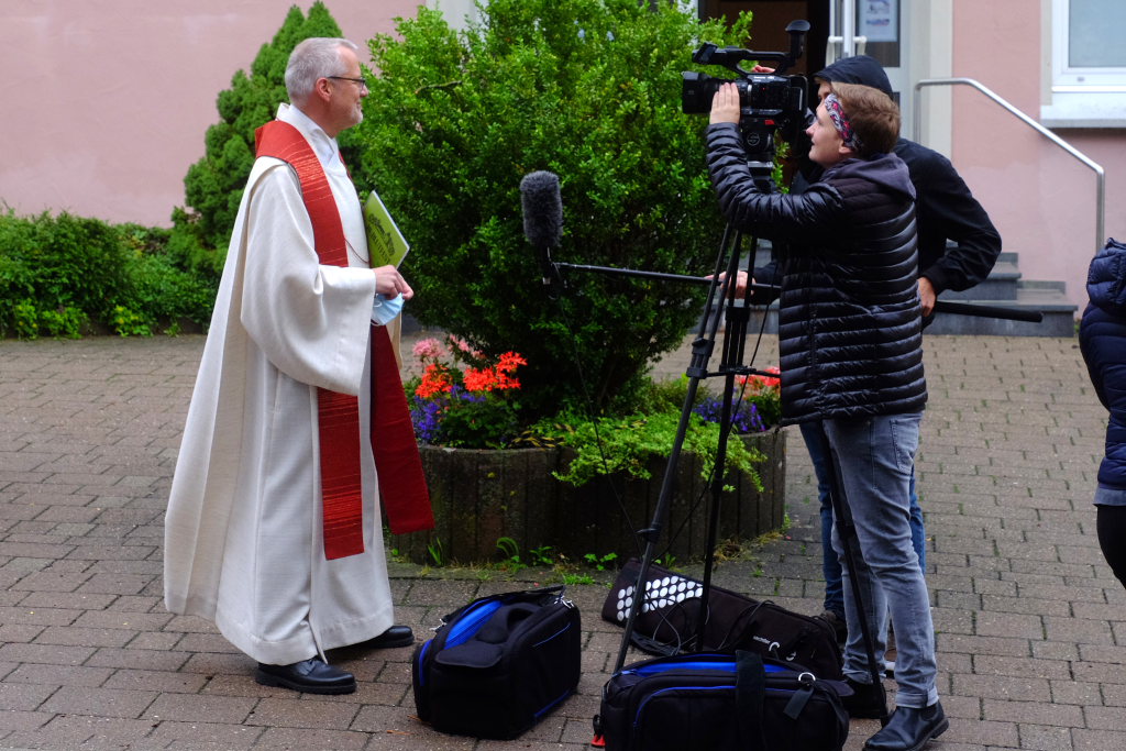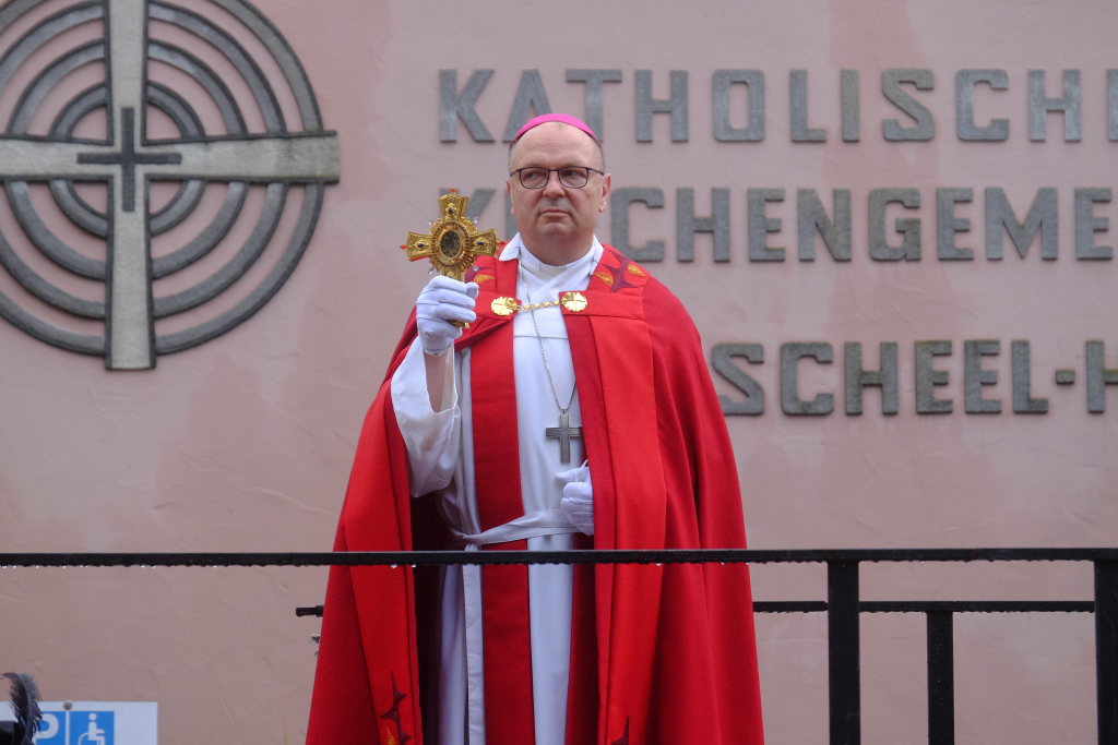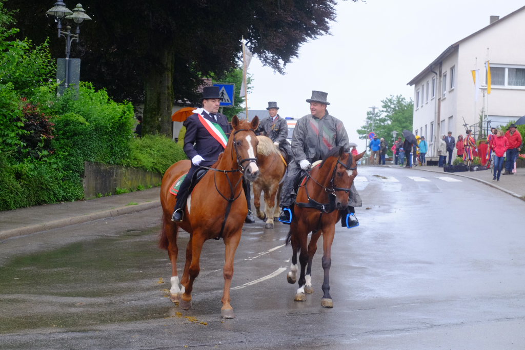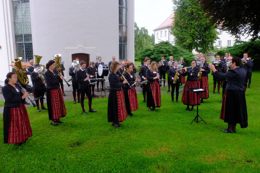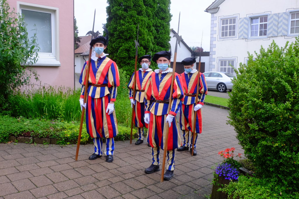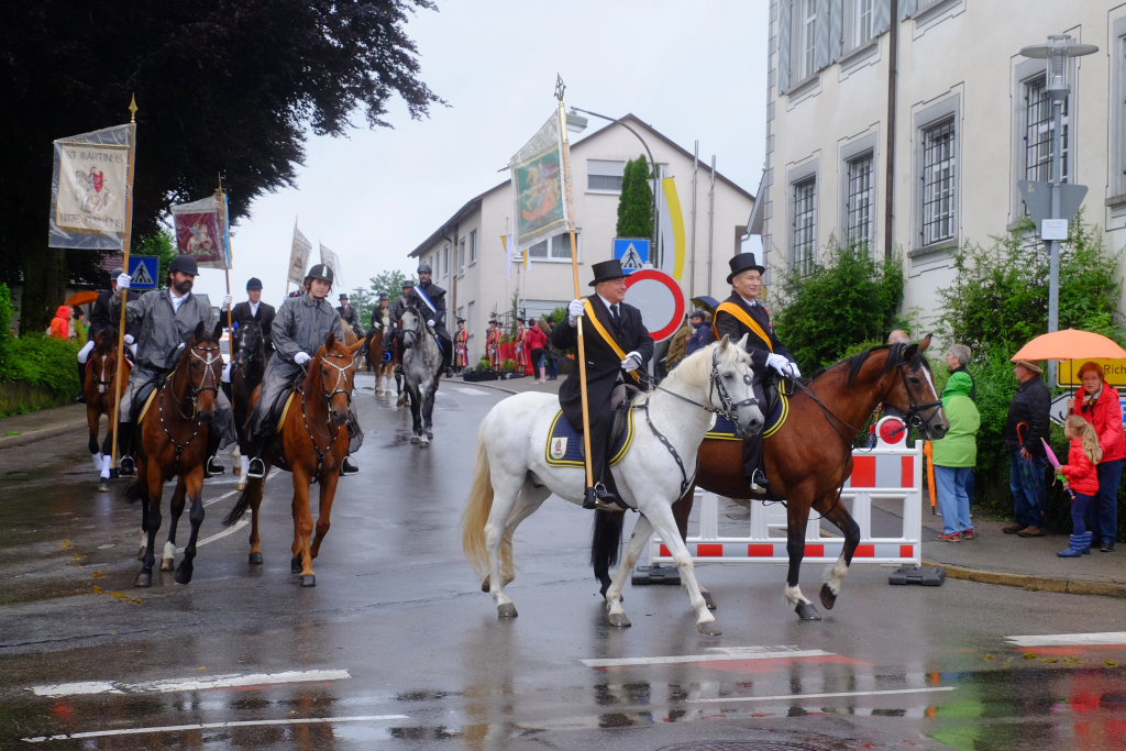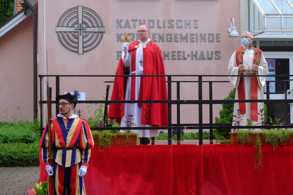 Nach dem im Vorjahr an diesem höchsten Wurzacher kirchlichen Feiertag nur eine „Überführungsfahrt“ vom Gottesberg nach St. Verena in Begleitung von vier Reitern möglich gewesen war, konnte sich in diesem Jahr jede Blutreitergruppe, die sonst mit zahlreichen Reitern teilnahm, sich mit zwei Reitern an der Prozession beteiligen. Um die Corona-Bestimmungen einhalten zu können, wurde von der Wallfahrtskommission für dieses Jahr ein neuer Prozessionsweg festgelegt, der den Reitern erst am Freitagmorgen am Startpunkt beim Pius-Scheel-Haus bekanntgegeben wurde. Dort empfing unter den Klängen der Stadtkapelle die erste Abteilung der Reiter, die sich in der Kirchbühlstraße für die Prozession versammelt hatten, von Weihbischof Gerhard Schneider den Segen. Über die Memminger Straße und den Salvatorhof in Wiesen führte der Weg den Heilig-Blut-Wagen mit der Reliquie die Straße hinauf Richtung Wengenreute, wo auf der Anhöhe beim Flurkreuz zwischen den beiden Birken die erste Gebetsstation an dem rund fünf Kilometer langen Prozessionsweg auf die Reiter wartete.