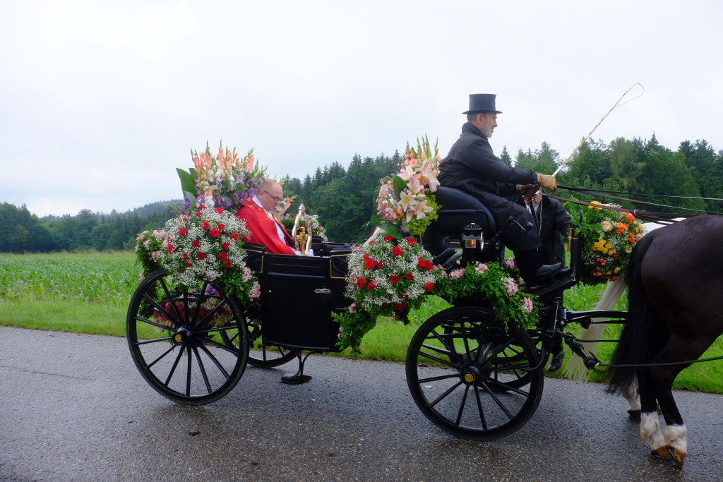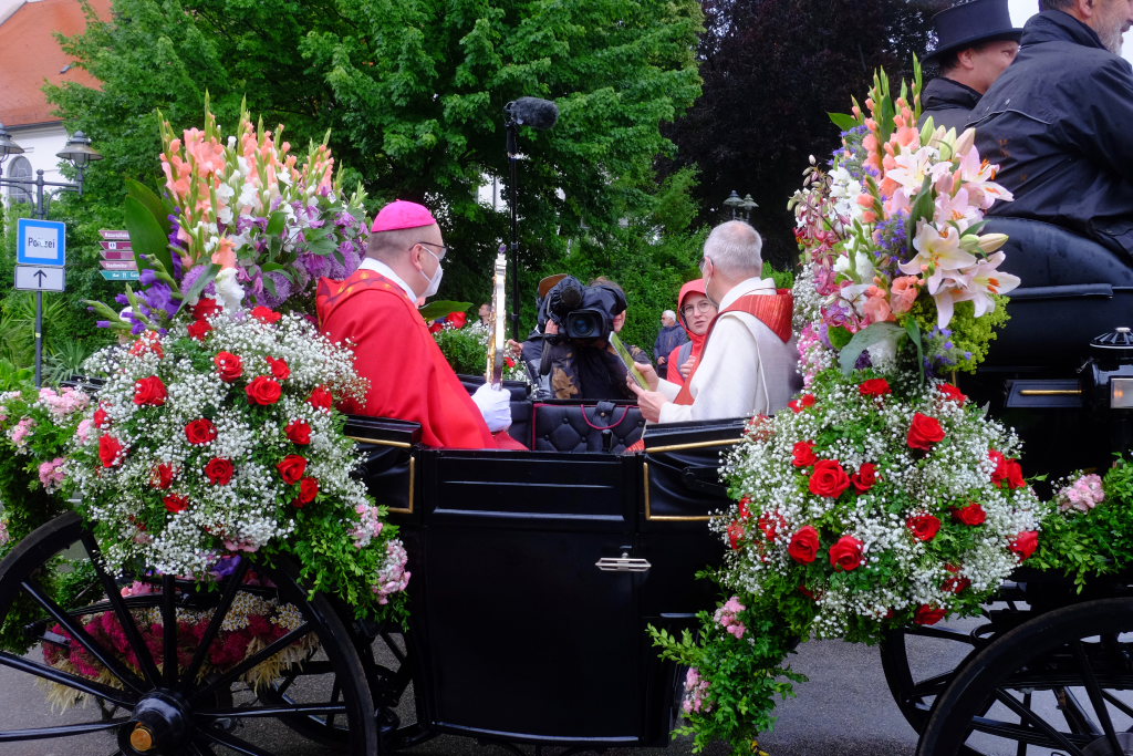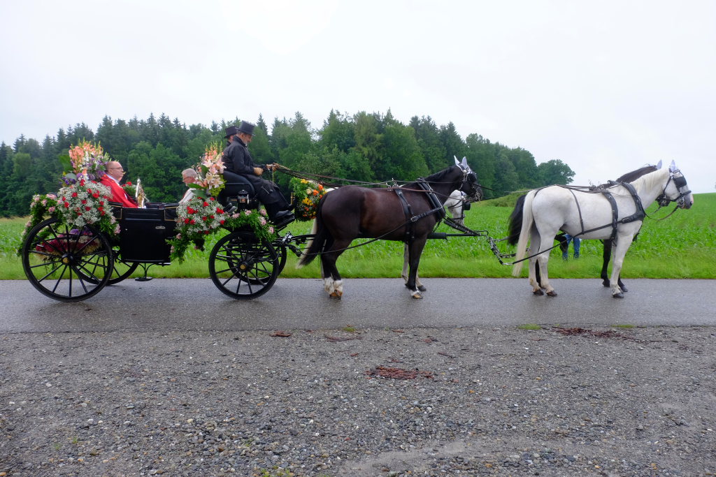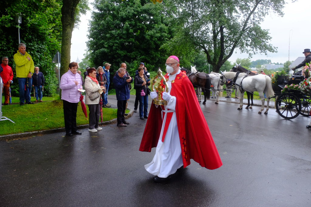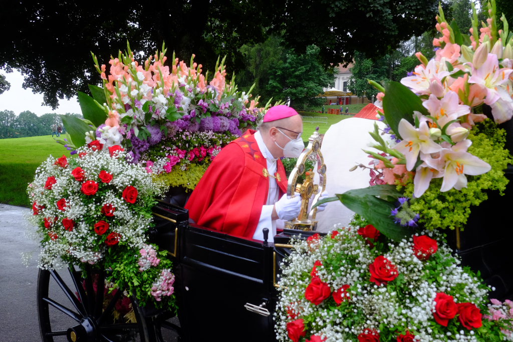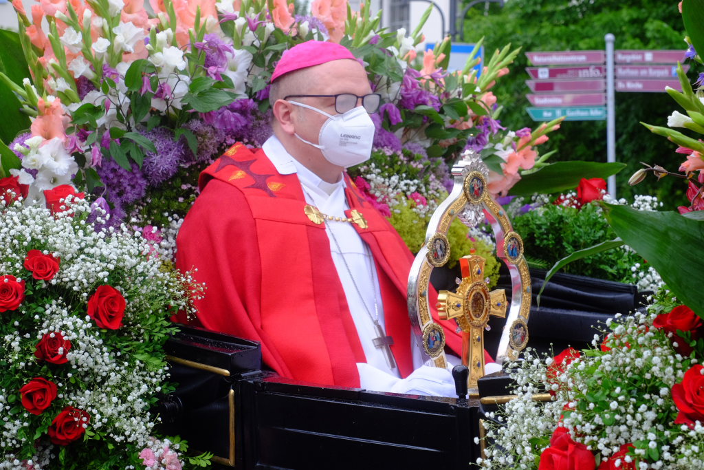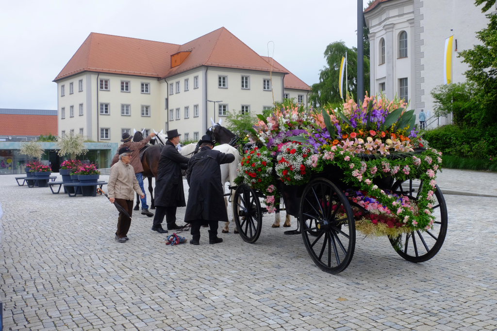 Während Weihbischof Gerhard Schneider und Pfarrer Stefan Maier die Heilig-Blut-Reliquie für das Pontifikalamt zu Fuß zur Gottesbergkirche trugen, lenkte der Kutscher den Heilig-Blut-Wagen zum Klosterplatz, wo er wie in all den Jahren zuvor in seiner ganzen Blumenpracht zur Schau gestellt wurde. Nicht fehlen durfte auch in diesem Jahr das Hinweisschild, den in diesem Jahr wieder ganz besonders gelungenen Blumenschmuck doch bitte bis zum Nachmittag noch unberührt zu lassen.