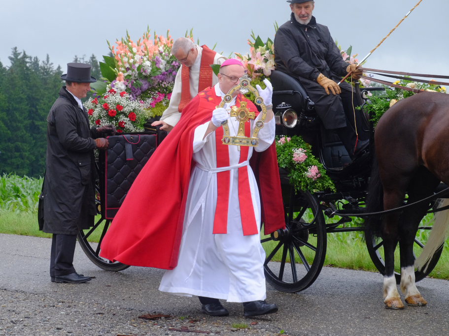 Bad Wurzach - Weihbischof Gerhard Schneider und Stadtpfarrer Stefan Maier durften in diesem ganz besonderen Jahr im Heilig-Blut-Wagen Platz nehmen, um mit der Heilig-Blut-Reliquie auf neuen Wegen der Reiterprozession den Segen zu spenden.