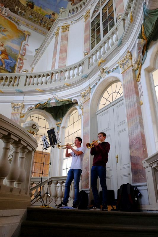 Nach einem kleinen Spaziergang der Gruppe – Straßer wurde von dem FDP-Kandidaten für den Wahlkreis Biberach, Florian Hirt, Prof. Dr. Hermann Wilske, dem Präsidenten des Landesmusikrates und dem FDP-Kandidaten bei der letzten Landtagswahl, Frank Scharr aus Wangen begleitet – vom Kurhaus zum Schloss wurde sie im Barocktreppenhaus von festlichen Trompetenklängen zweier Nachwuchsmusiker Moritz Ulmschneider und Fabio Weishaupt der Musikschule empfangen. Von dort führte der Weg der Gruppe dann über eine Treppe, die genau soviele Stufen hat, wie ein Klavier Tasten, hinauf bis unter das Dach des Schlosses, wo seit einigen Monaten die Jugendmusikschule (endlich) eine gemeinsame Heimat gefunden hat.