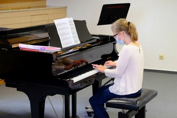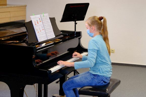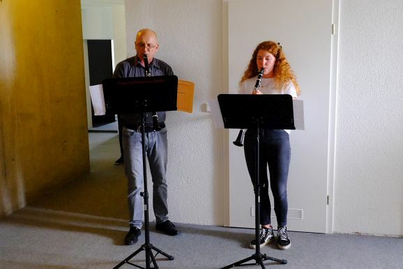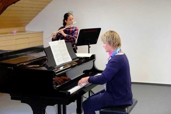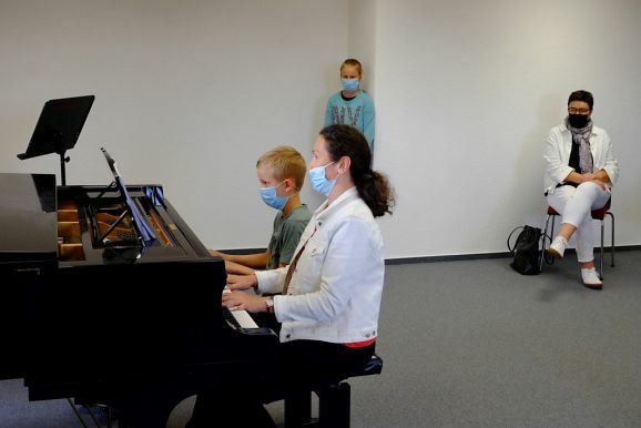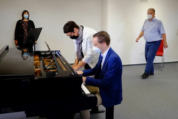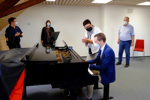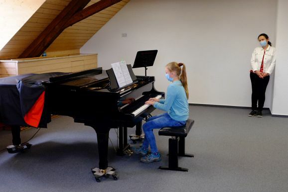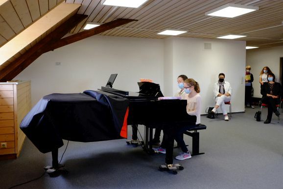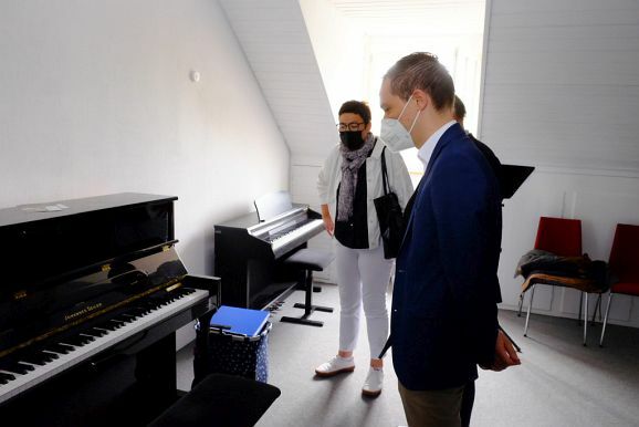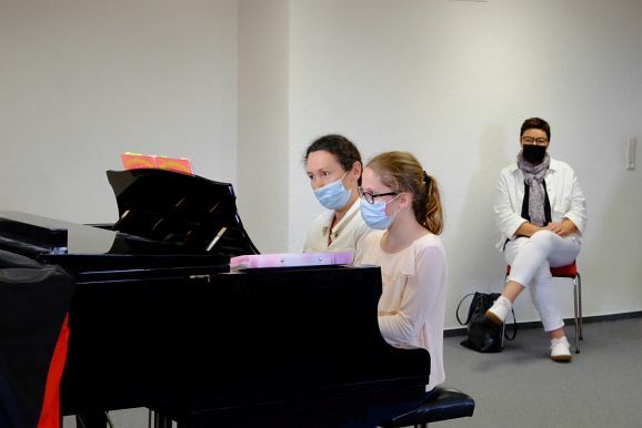 Das Prunkstück der JMS ist das Flügelzimmer, ein Raum in dem auch kleinere Ensembles vor Publikum ihr Können vorstellen können. Dies taten dann auch Bernadette Vogt am Flügel gemeinsam mit ihrer Querflötenschülerin Anna Butscher, die das ganze Jahr über für den Wettbewerb „Jugend musiziert“ geübt hatte und dann wegen Corona nicht antreten durfte. Dafür erntete sie nun den verdienten Applaus der Besuchergruppe. Ähnliches widerfuhr auch der Klarinettenschülerin von Georg Stankalla, Sophia Längst, der dieser bescheinigte, trotz aller Hindernisse große Fortschritte gemacht zu haben. Klavierlehrerin Larissa Bohr-Chernjak ließ mit Linda Weishaupt, Theresa und David Merk, gleich mehrere Schülerinnen und Schüler vor den Besuchern ihr Können zeigen.