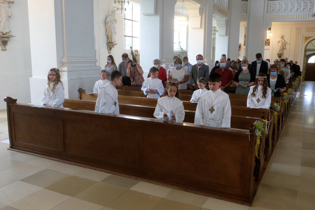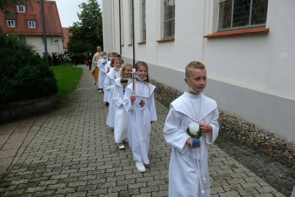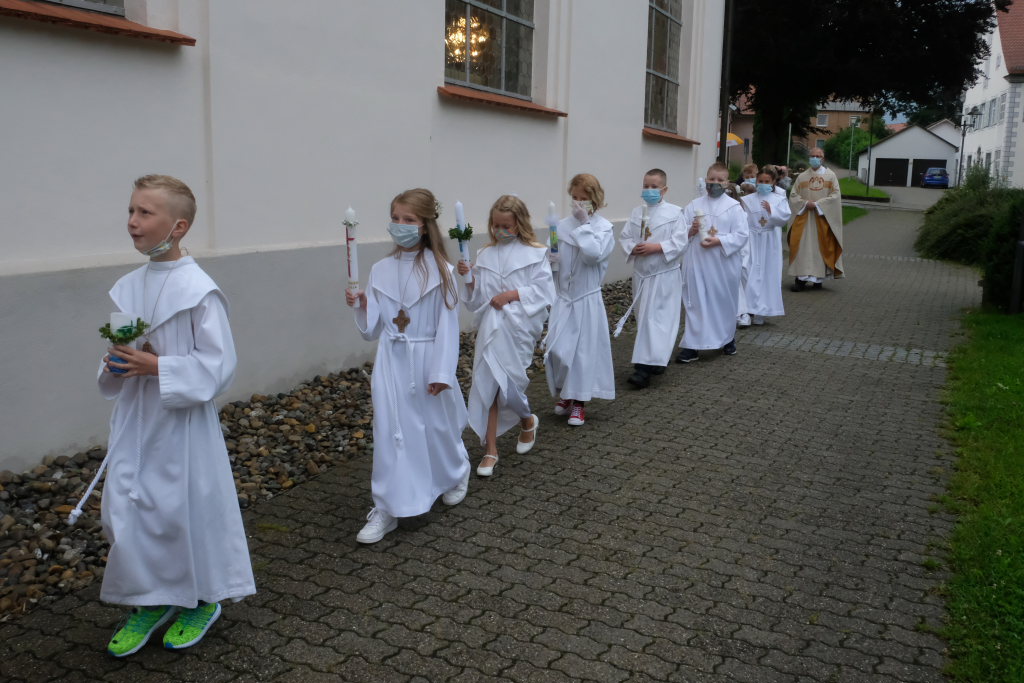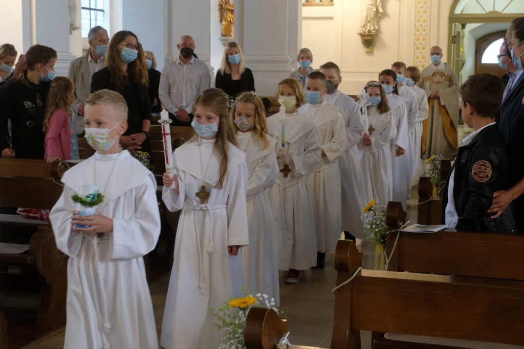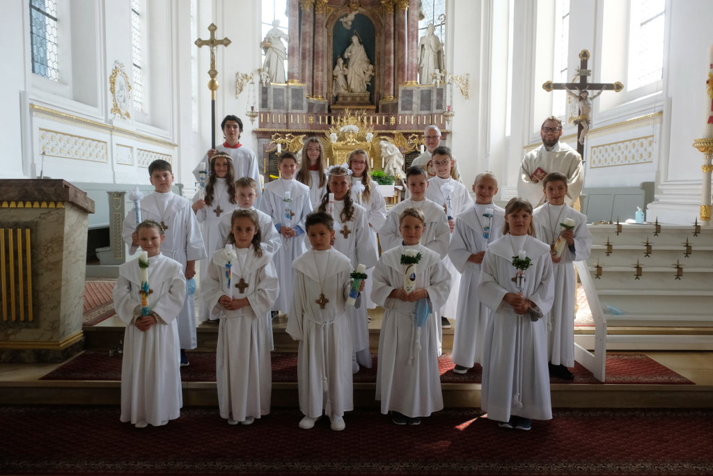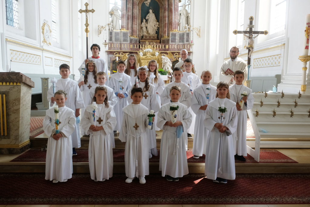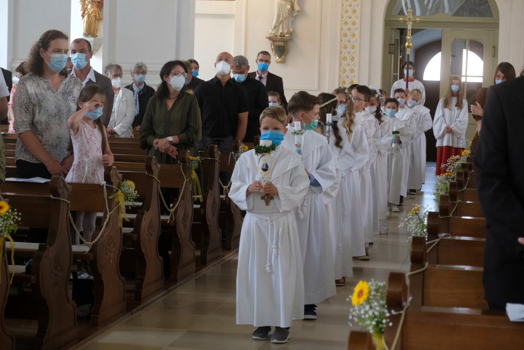 Nach der Einstimmung mit Pastoralreferent Michael Maier im Pius-Scheel Gemeindehaus wurden die Kommunionkinder musikalisch von der Stadtkapelle den in der Kirche wartenden Eltern, Geschwistern und Verwandten angekündigt, ehe sie feierlich – begleitet von Pastoralreferent Michael Maier und Stadtpfarrer Stefan Maier – feierlich in das Gotteshaus einzogen.