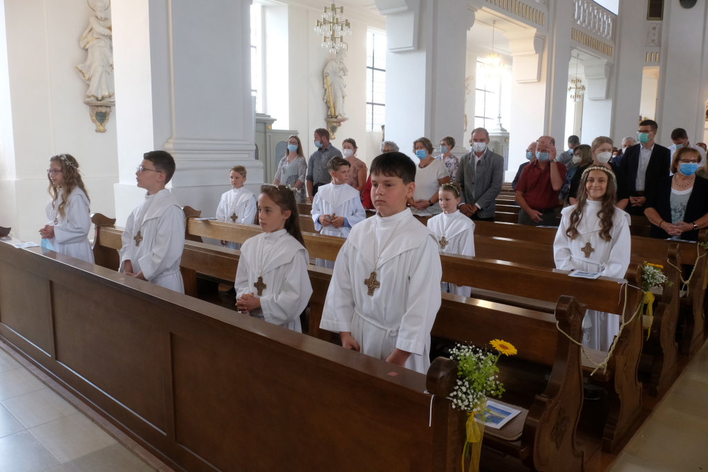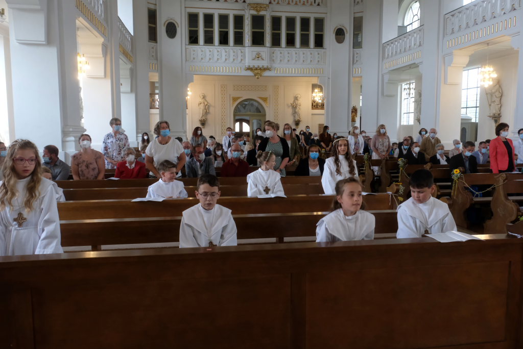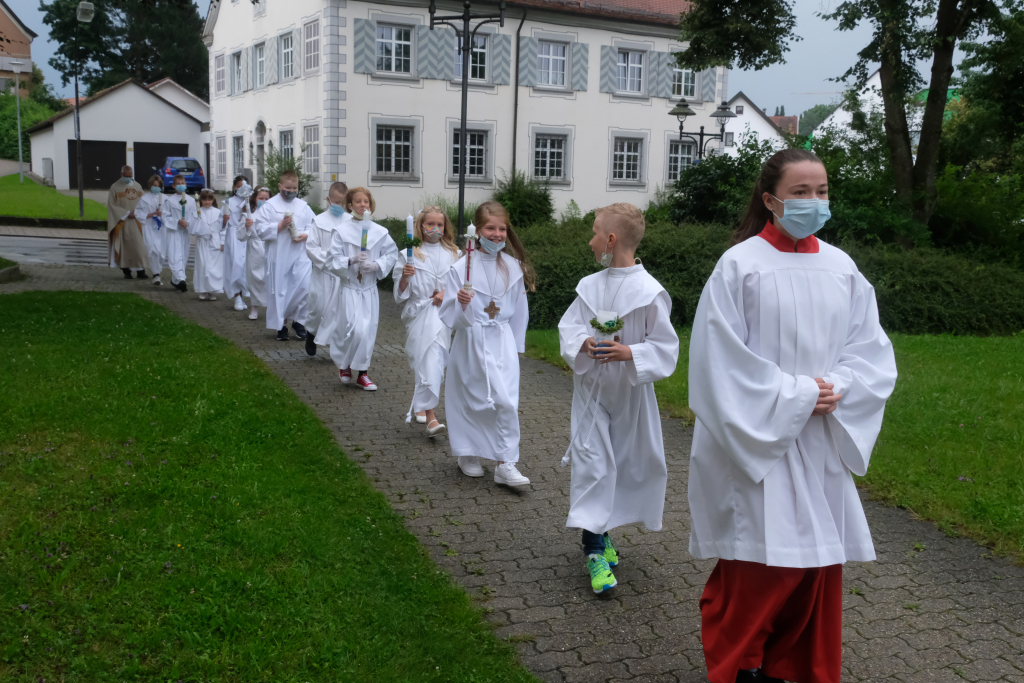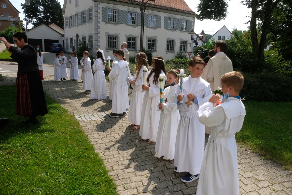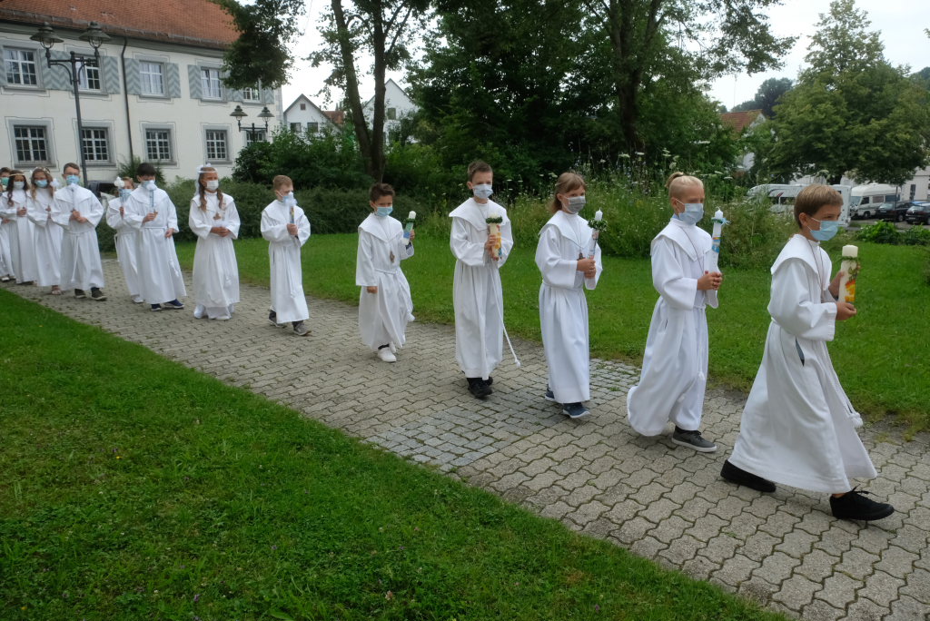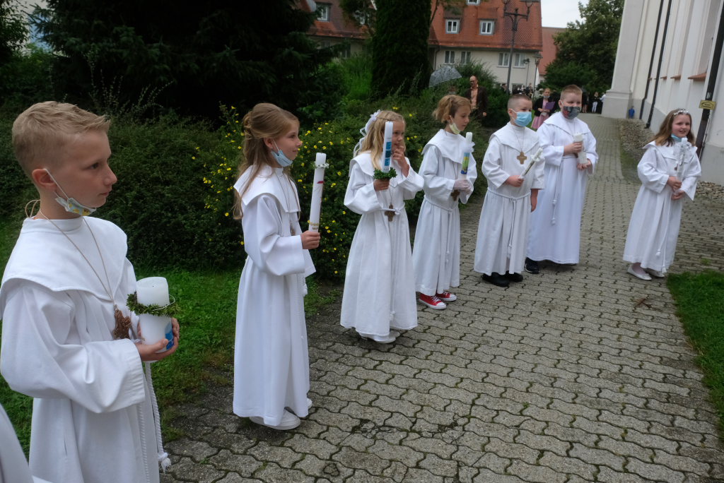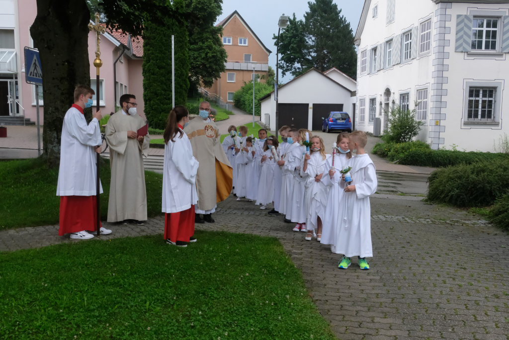 Nach der Einstimmung mit Pastoralreferent Michael Maier im Pius-Scheel Gemeindehaus wurden die Kommunionkinder musikalisch von der Stadtkapelle den in der Kirche wartenden Eltern, Geschwistern und Verwandten angekündigt, ehe sie feierlich – begleitet von Pastoralreferent Michael Maier und Stadtpfarrer Stefan Maier – feierlich in das Gotteshaus einzogen.