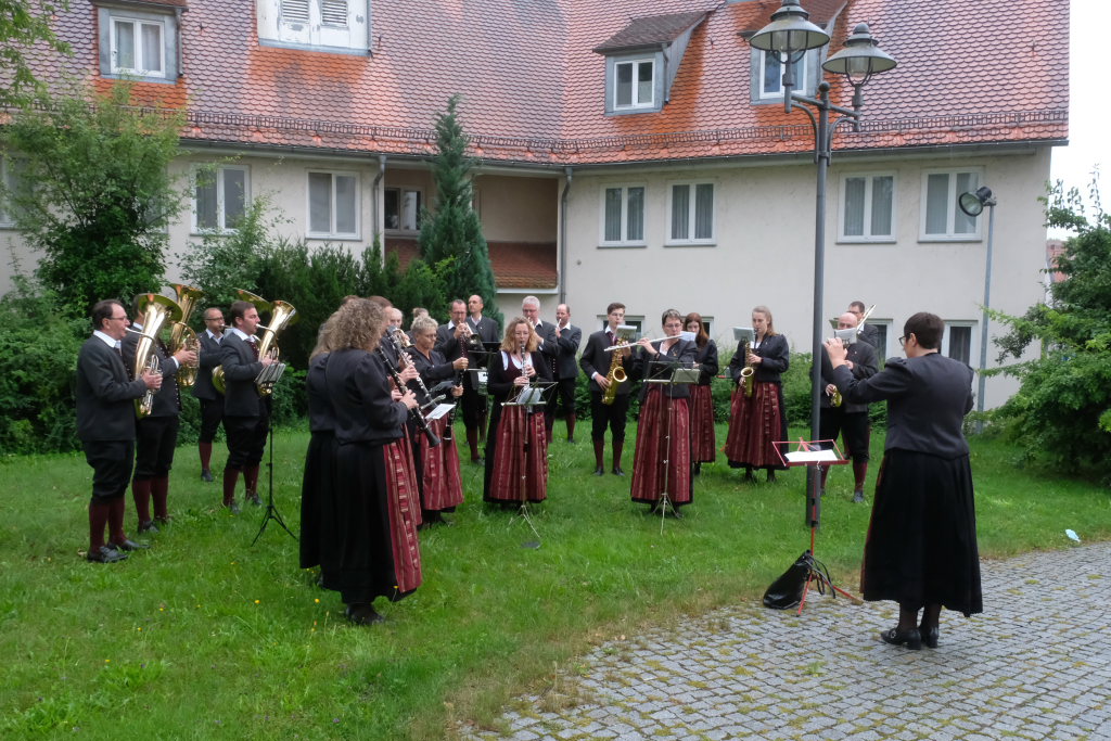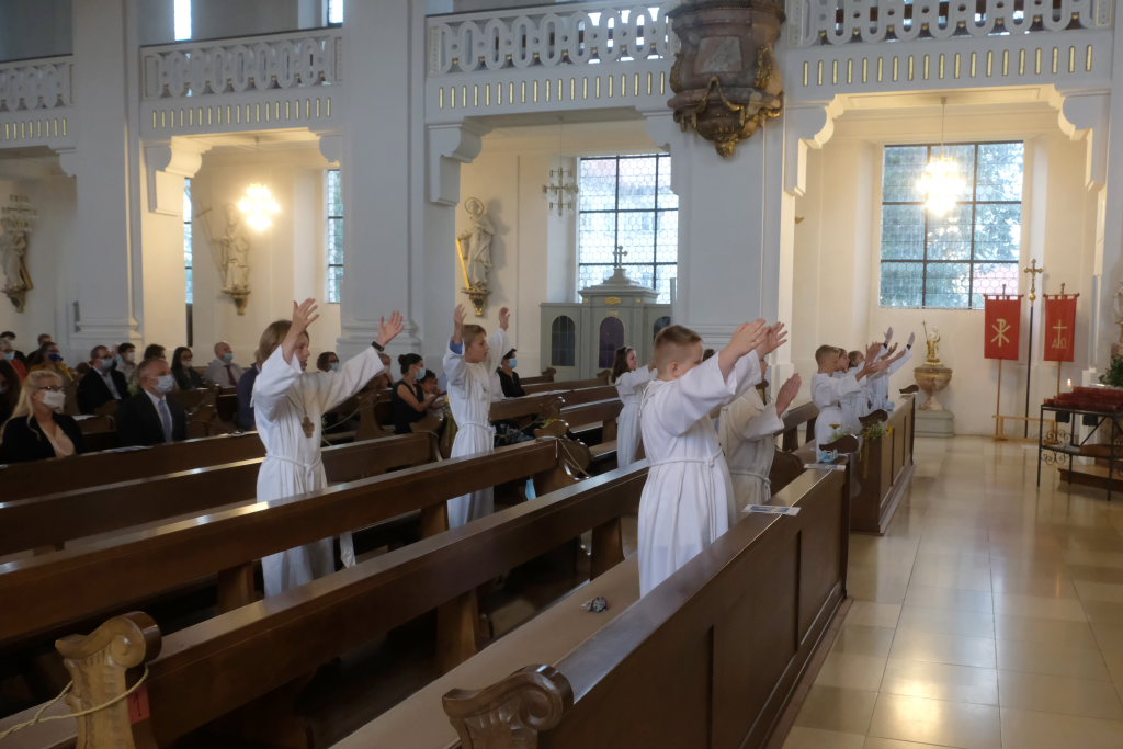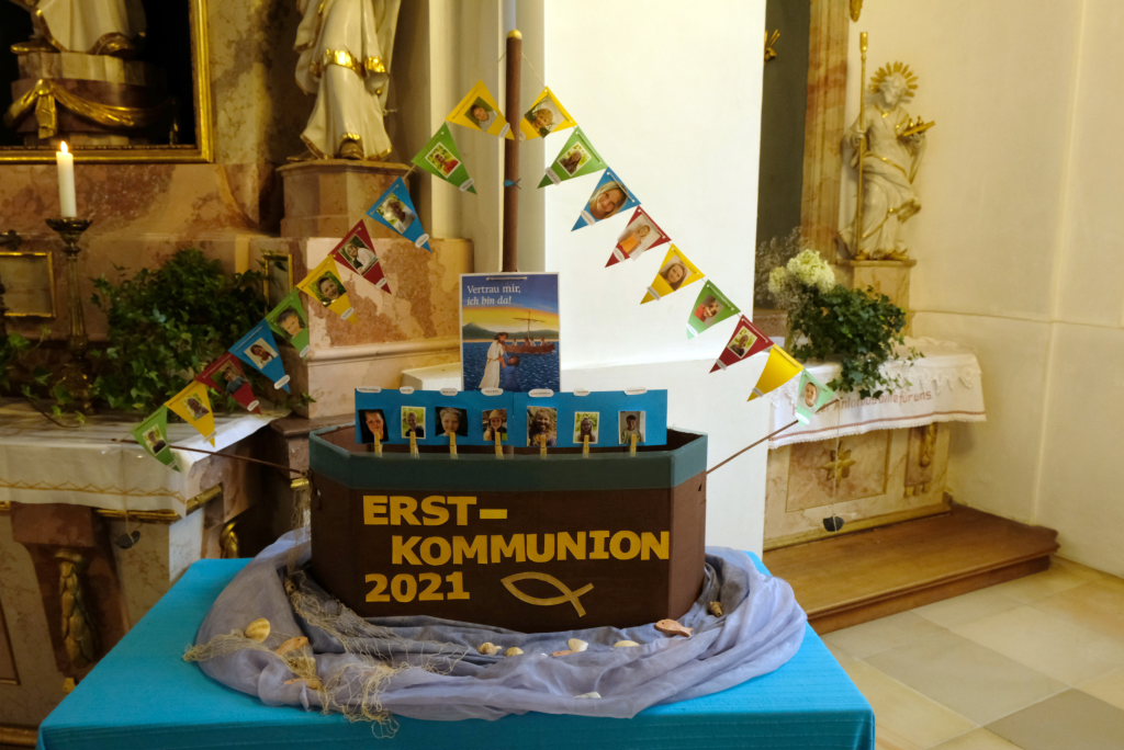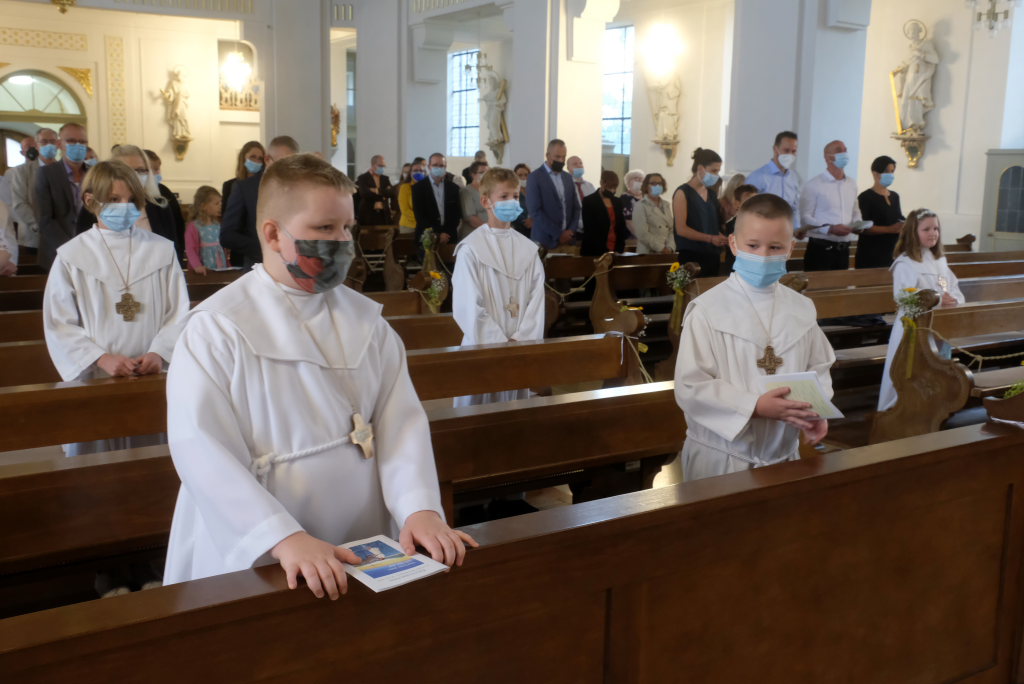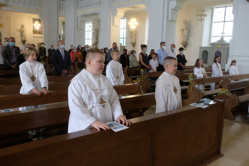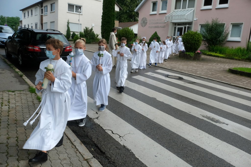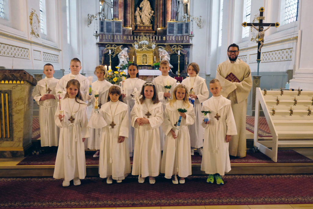 Nach der Einstimmung mit Pastoralreferent Michael Maier im Pius-Scheel Gemeindehaus wurden die Kommunionkinder musikalisch von der Stadtkapelle den in der Kirche wartenden Eltern, Geschwistern und Verwandten angekündigt, ehe sie feierlich – begleitet von Pastoralreferent Michael Maier und Stadtpfarrer Stefan Maier – feierlich in das Gotteshaus einzogen.