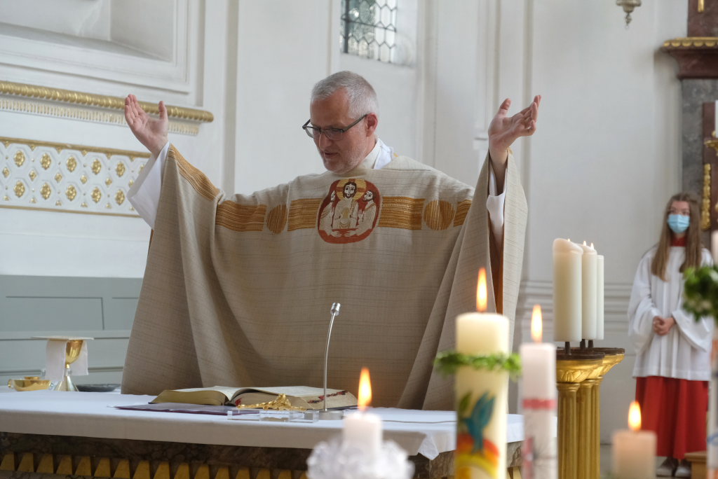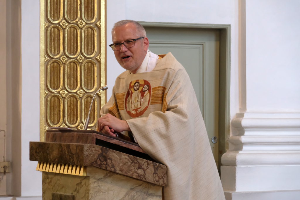 In seiner Predigt nahm Michael Maier Bezug auf den Evangeliumstext Matthäus 14, 22-33 in dem Jesus über das Wasser geht und Petrus, beim Versuch es ihm gleich zu tun, im See zu versinken droht. Sofort streckt Jesus die Hand aus und rettet den zweifelnden Petrus aus den Fluten. Petrus merkt: „Jesus ist für mich da.“