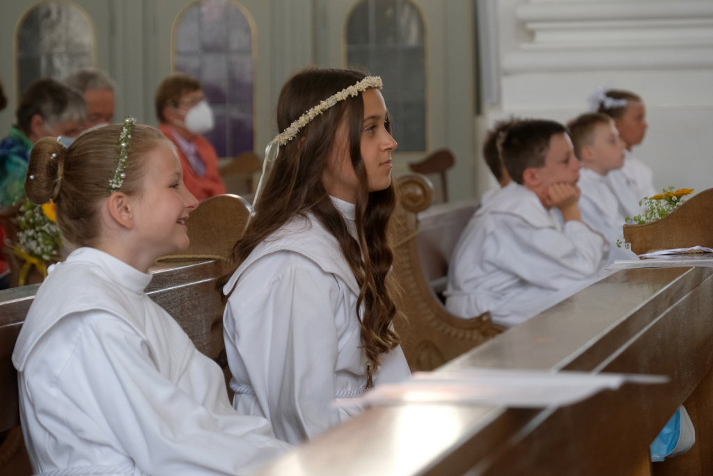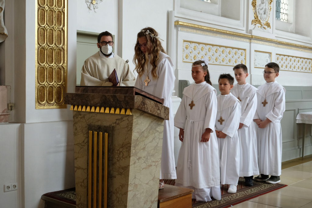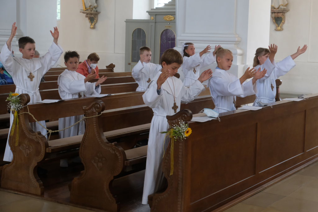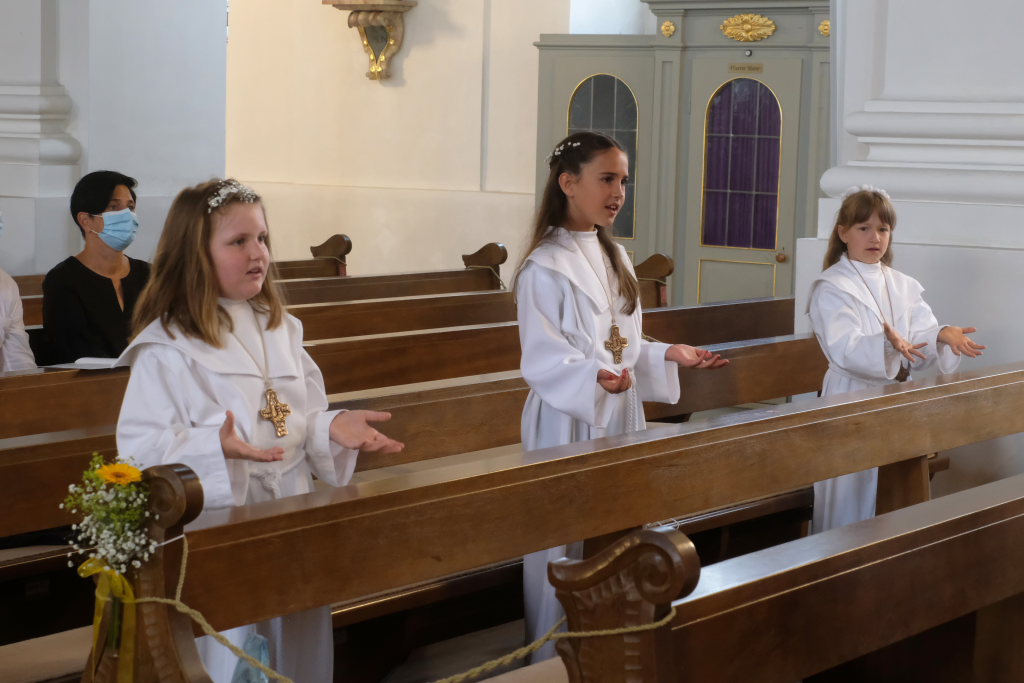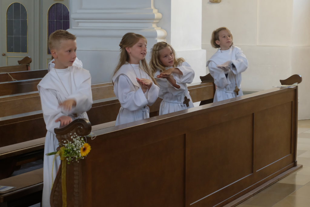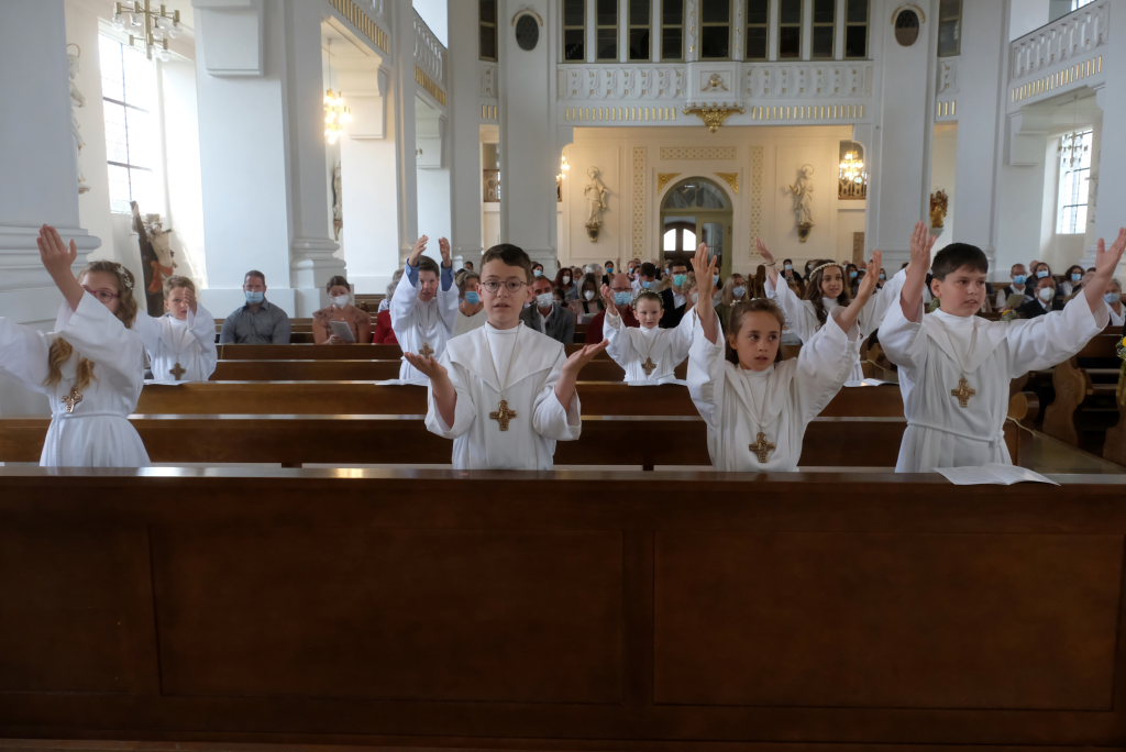Bei der Taufe haben Eltern und Paten das Glaubensbekenntnis für die Kinder gesprochen, nun seien sie selbst dazu in der Lage, sprach Pfarrer Maier die Kinder an. Mit ihrem fünfmaligen Bekenntnis „Ich glaube“ war der Weg für den erstmaligen Empfang der Hostie geebnet.