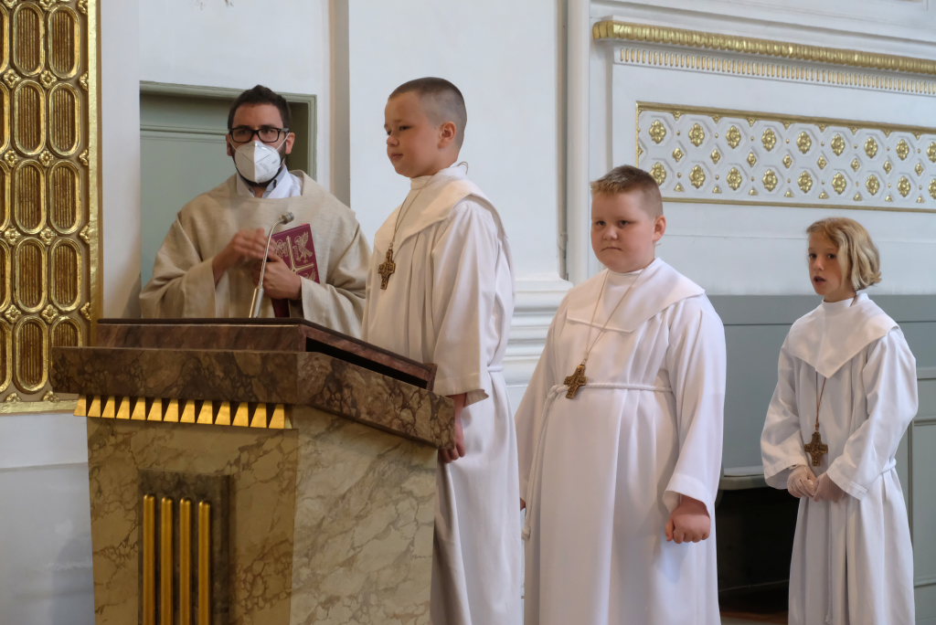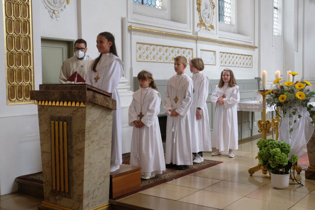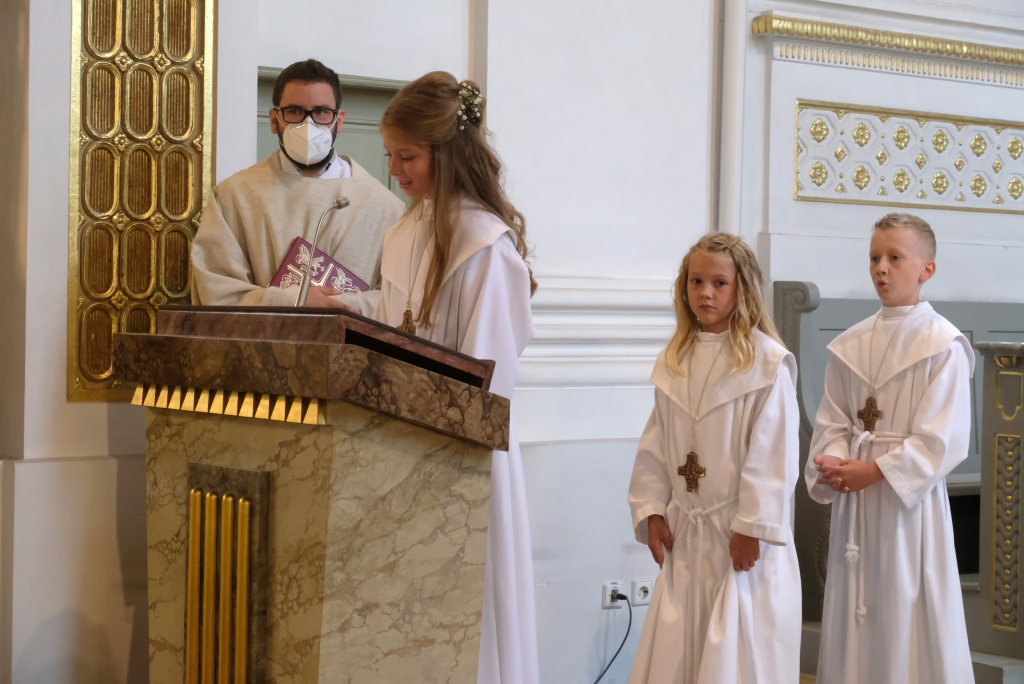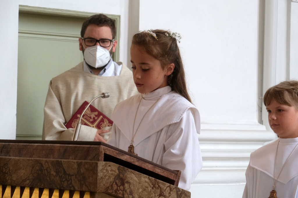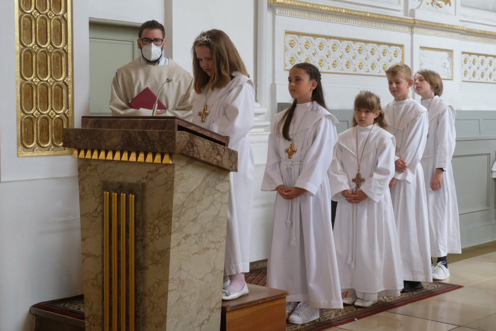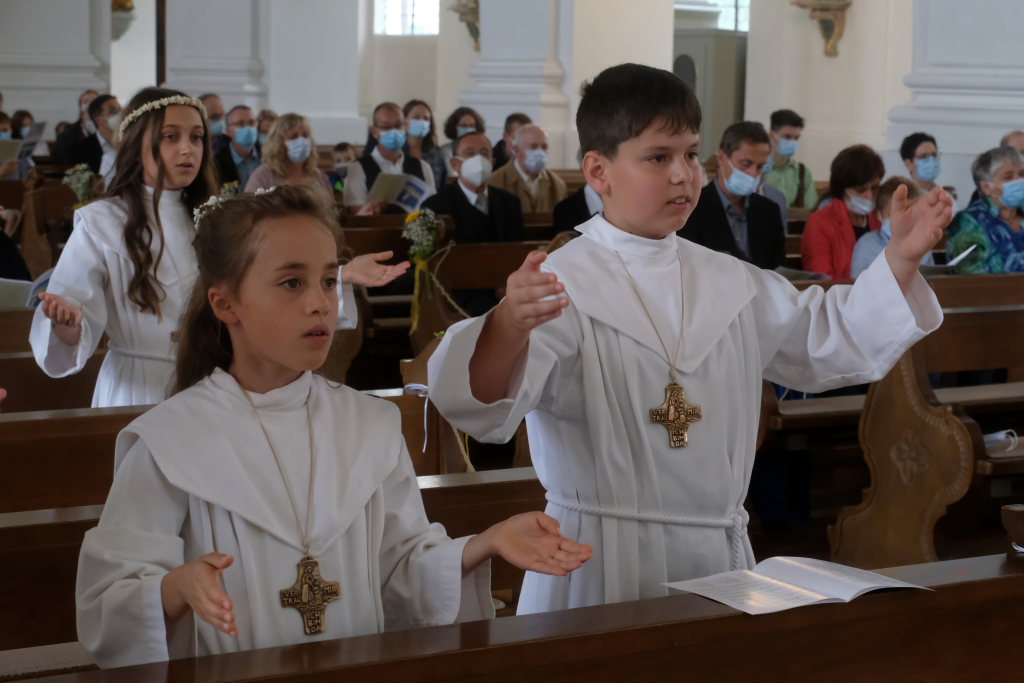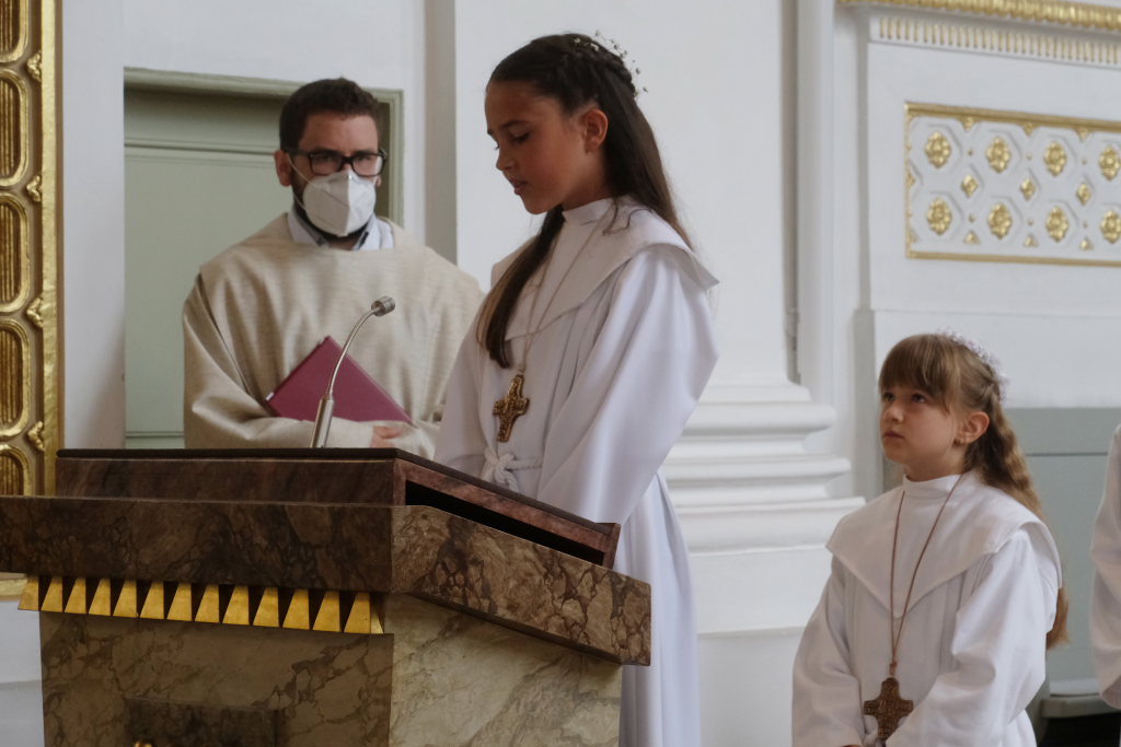 Bei der Taufe haben Eltern und Paten das Glaubensbekenntnis für die Kinder gesprochen, nun seien sie selbst dazu in der Lage, sprach Pfarrer Maier die Kinder an. Mit ihrem fünfmaligen Bekenntnis „Ich glaube“ war der Weg für den erstmaligen Empfang der Hostie geebnet.