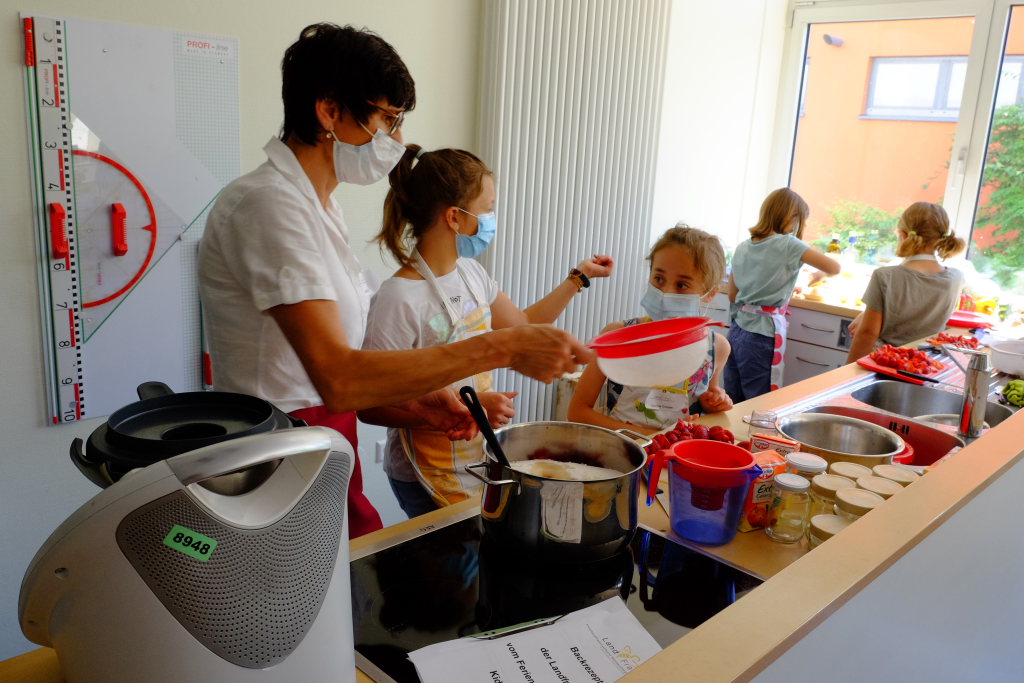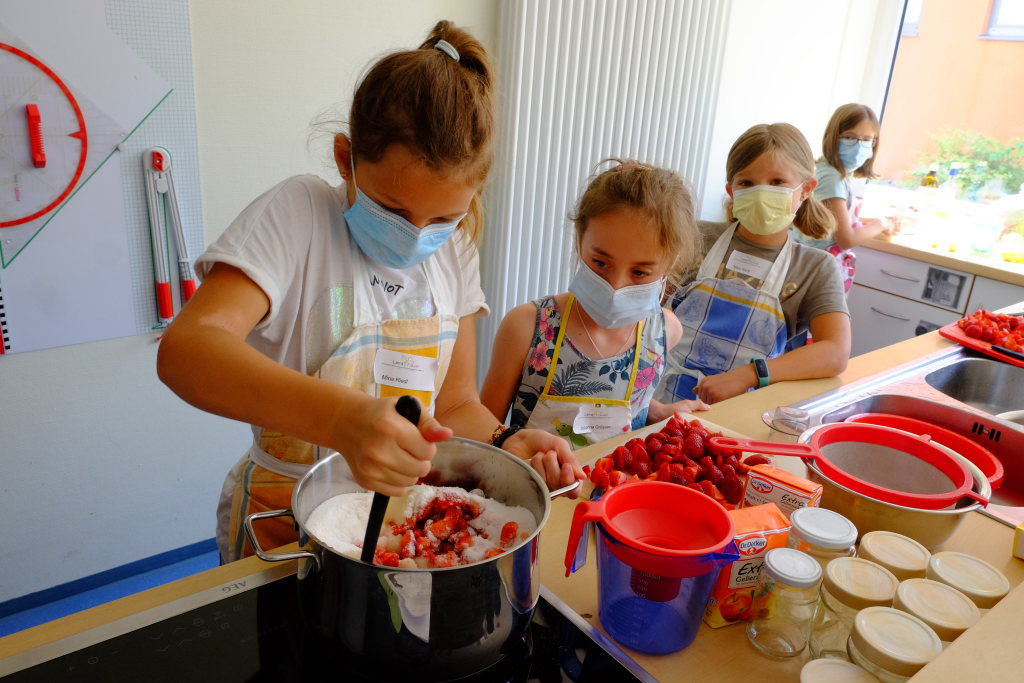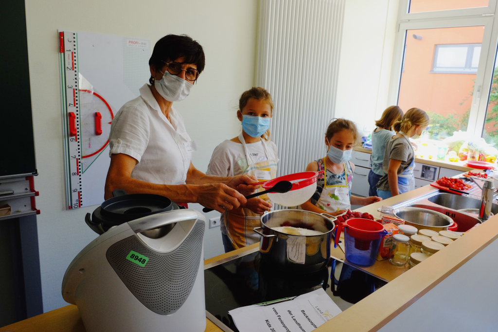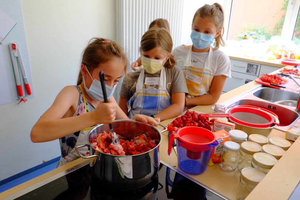 Am Anfang des Großen Kochens stand erst mal die Vorbereitung: Sieben Kilo Erdbeeren wollten erst einmal gewaschen und gerichtet werden, damit aus den schmackhaften Beeren leckere Erdbeermilch, Smoothies und Marmelade entstehen konnte. Bei der Zubereitung der Marmelade war den Landfrauen wichtig, dass die Kinder beide Methoden kennenlernten, die moderne mit dem Thermomix und diejenige nach Großmutter Art mit viel Rühren im Kochtopf.