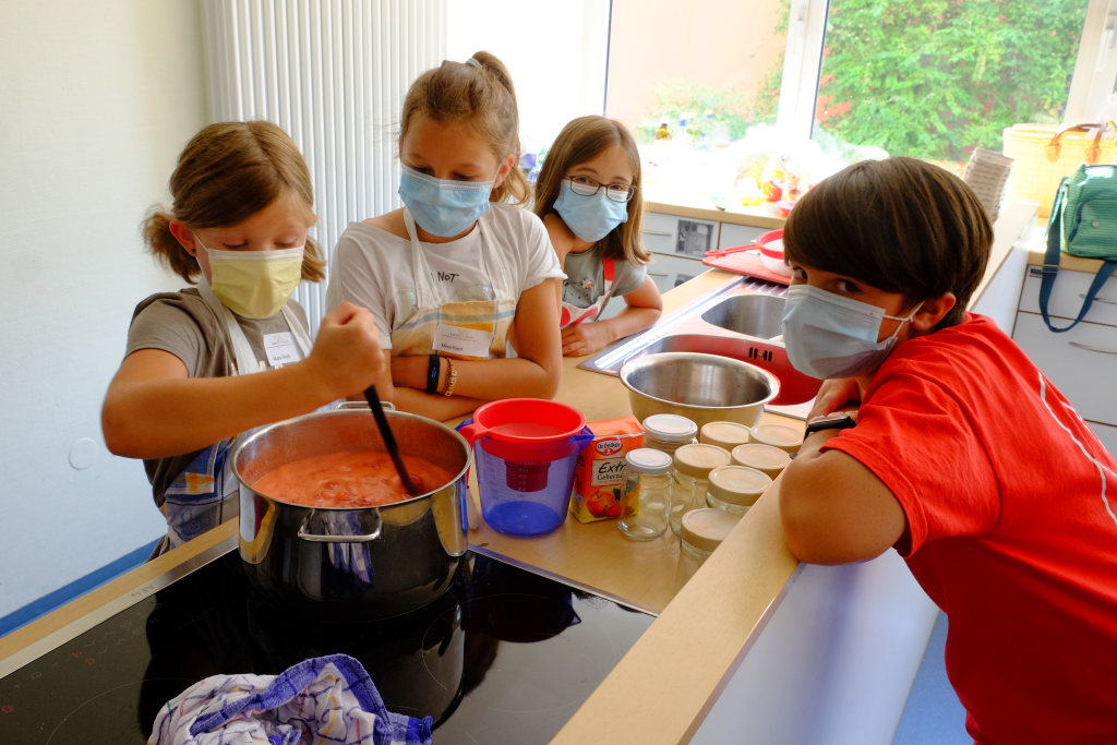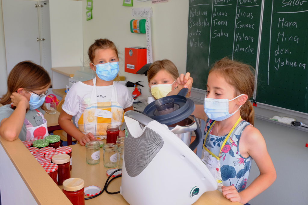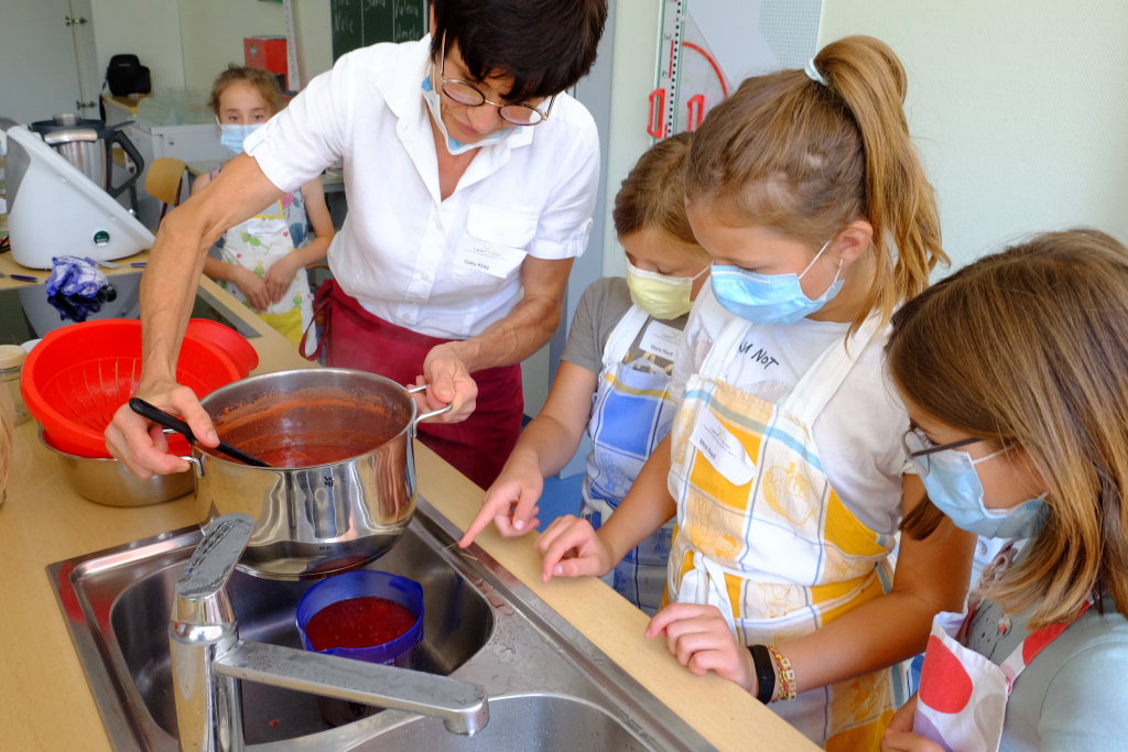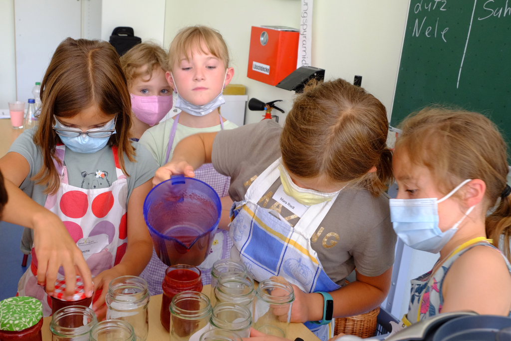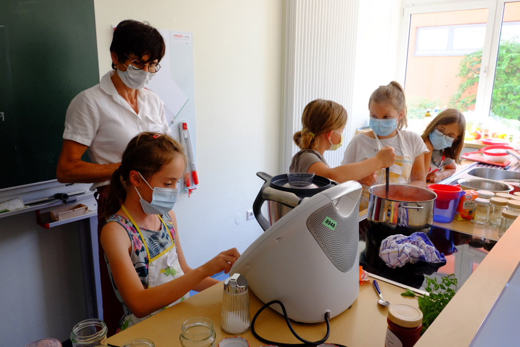 Am Anfang des Großen Kochens stand erst mal die Vorbereitung: Sieben Kilo Erdbeeren wollten erst einmal gewaschen und gerichtet werden, damit aus den schmackhaften Beeren leckere Erdbeermilch, Smoothies und Marmelade entstehen konnte. Bei der Zubereitung der Marmelade war den Landfrauen wichtig, dass die Kinder beide Methoden kennenlernten, die moderne mit dem Thermomix und diejenige nach Großmutter Art mit viel Rühren im Kochtopf.