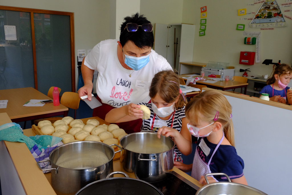 Beim Backen stand ein Hefezopf und das Brot für den vegetarischen Linsenburger auf dem Programm. Dampfnudeln mit Vanillesoße gab es als Vorspeise, auch Vitamine in Form eines gemischten Salates wollten von den 8-12jährigen Köchen vor- und zubereitet werden.