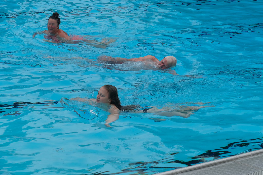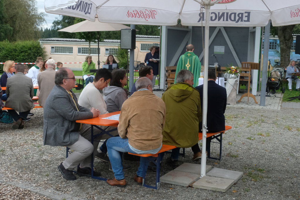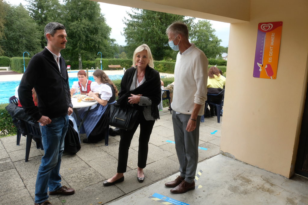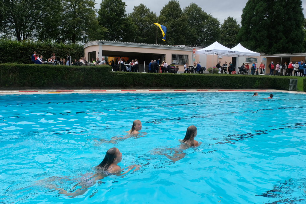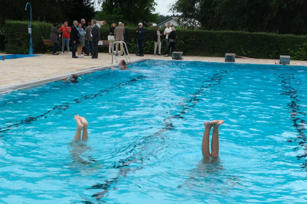Nachdem die Witterung nicht gerade sommerlich und dem Anlass entsprechend warm war, mussten die Organisatoren des Jubiläumsfestes um Kurt Miller, Robert und Hermann Müller und die anderen Ehrenamtlichen etwas improvisieren. Wenigstens hatte Petrus ein Einsehen, während des Gottesdienstes und der Festreden blieb es trocken, Bei den Führungen durch das Bad spickelte sogar hin und wieder die Sonne durch die graue Wolkendecke. Nach einer Wassertemperaturprüfung ließ es sich MdB Josef Rief nicht nehmen, dem Beispiel einiger mutiger Mädchen zu folgen und einige Bahnen im azurblauen Becken zu schwimmen.