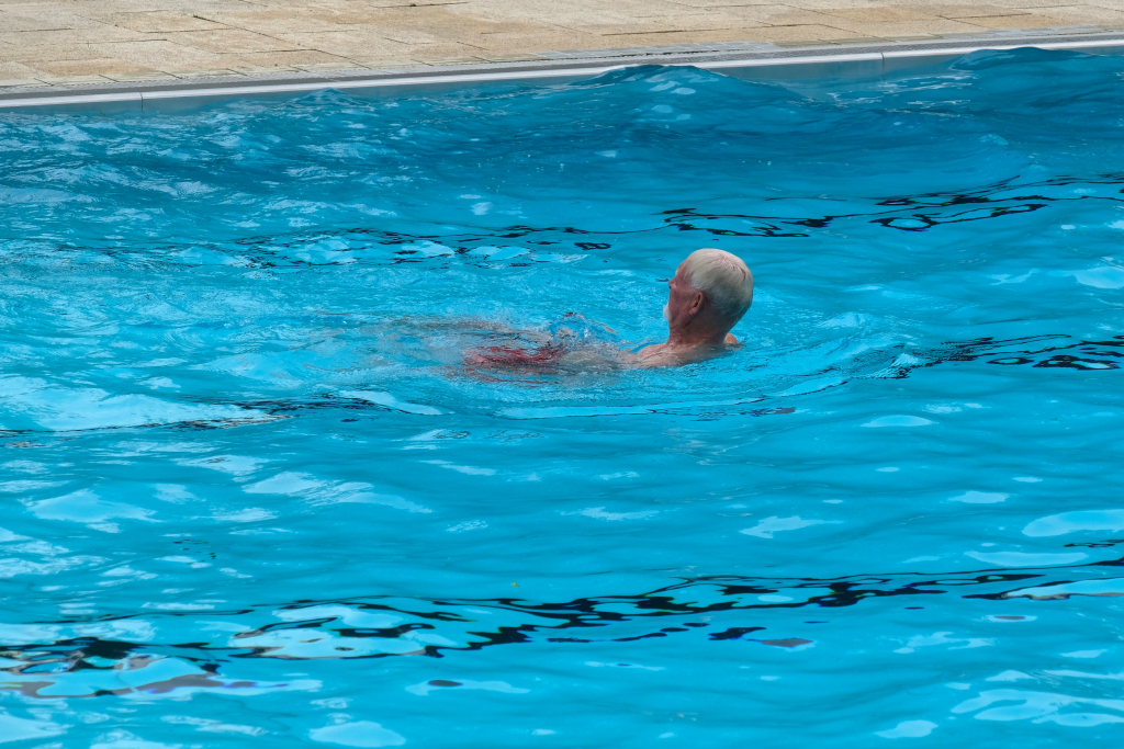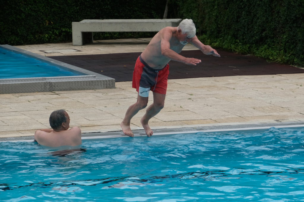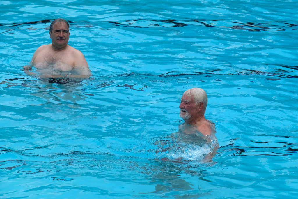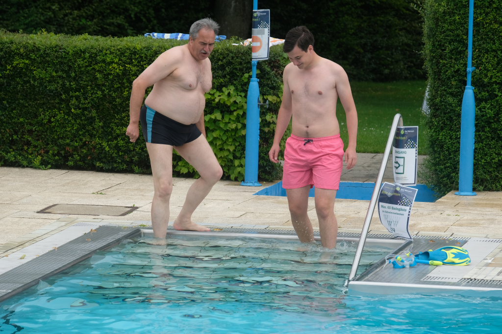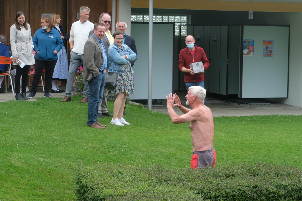 Auch der damalige Bürgermeister Meinhard Baron, dessen legendärer Kopfsprung im feinen Anzug bei der Eröffnung des Bades zum Jubiläum hin wieder in aller Munde war, gesellte sich mit einem Kopfsprung (aber ohne Anzug) unter dem Applaus der zahlreichen Besucher zu dem Abgeordneten ins Becken.