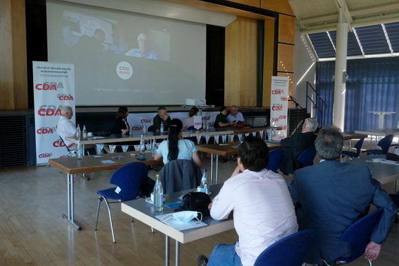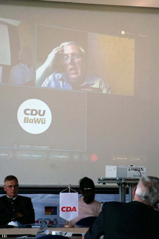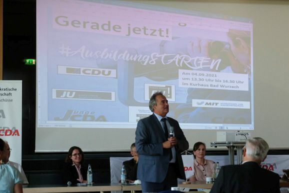Waldemar Westermayer sagte in seinem Grußwort, dass Armin Laschet, der Kanzlerkandidat der Union in den Medien zu schlecht gemacht werde, denn seine Stärke liege in der Teamfähigkeit: „Er macht in NRW einen guten Job.“ Der Arbeitsminister aus dem Kabinett Laschets in NRW, Karl Josef Laumann, zugleich auch der Bundesvorsitzende des CDA, sagte in seiner per Videoschalte in den Kursaal übertragenen Rede: „Die Duale Ausbildung hat wesentlich zum Erfolg unseres Bildungssystems beigetragen.“