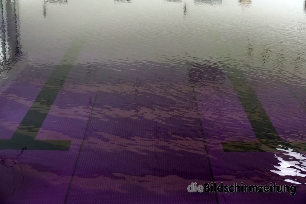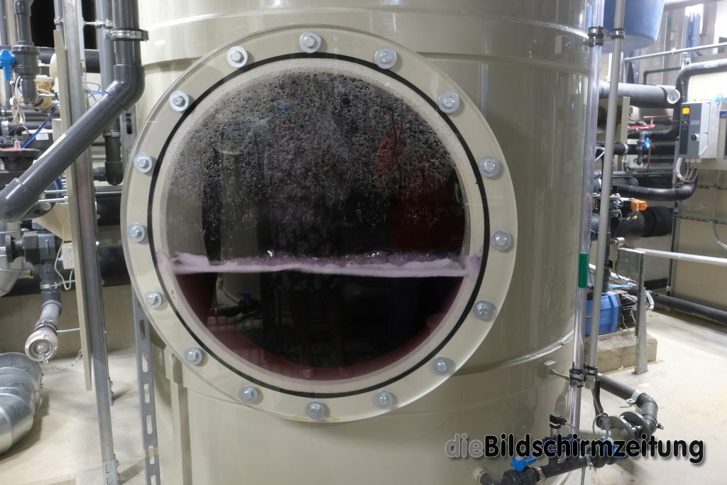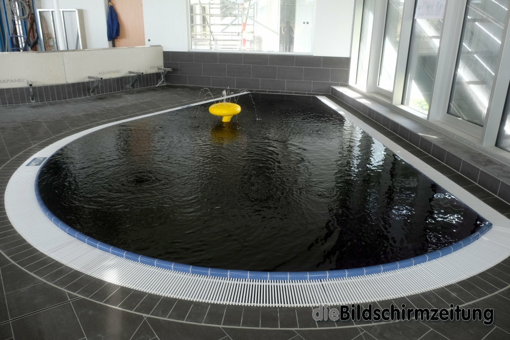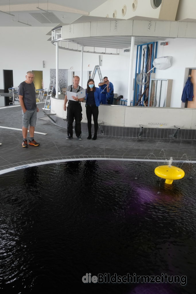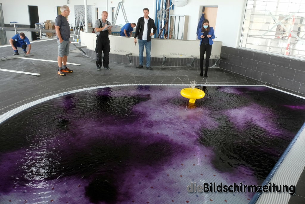 Gert Blüme von der „Wassertechnik Wertheim“ prüfte mittels der Farbe Eriobraun, die das Wasser in den Becken violett-schwarz einfärbte, ob sich die Farbe gleichmäßig verteilt. Als Zeitrahmen wählte er 15 Minuten, tatsächlich war das Wasser im großen Becken bereits nach fünf Minuten in ein undurchdringliches Schwarzviolett gefärbt. Dieser Test ist erforderlich, um festzustellen, ob die Chlorierung einwandfrei funktioniert. Damit wird die Testphase eingeläutet, es werden die technischen Anlagen überprüft und – falls erforderlich – Nachjustierungen durchgeführt.