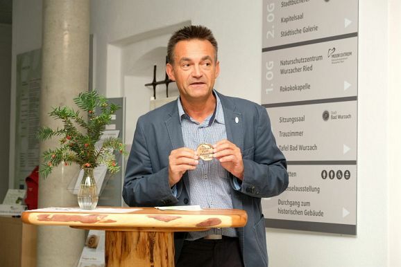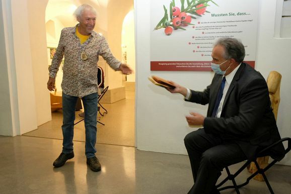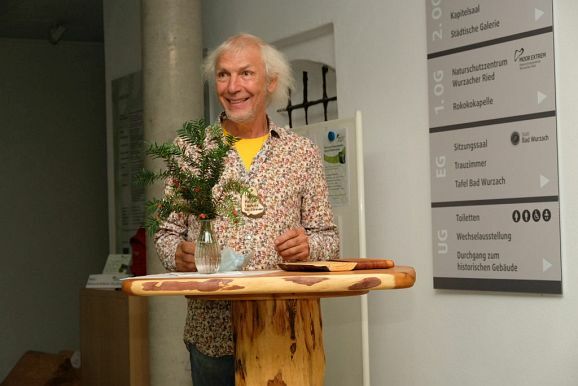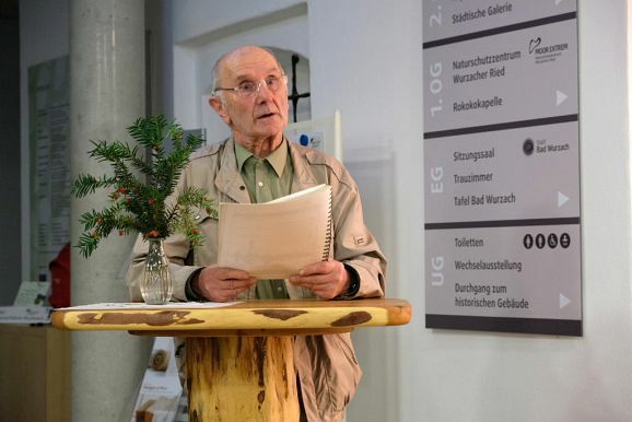 Agrarbiologe Hubert Fischer aus Fronreute, der sich seit Jahrzehnten um die letzten natürlichen Eibenvorkommen in der Region kümmert, ging in seiner Ansprache auf die Entstehungsgeschichte der Ausstellung ein. Er habe die Idee dafür Horst Weisser vorgetragen, die dieser gerne aufgenommen hatte. Corona und Lockdown seien dabei der Entwicklung der Ausstellung entgegen gekommen. 1980 wurde angenommen, die Eibe sei hierzulande nicht mehr heimisch, da Eibenholz damals nur noch aus England importiert werden konnte.