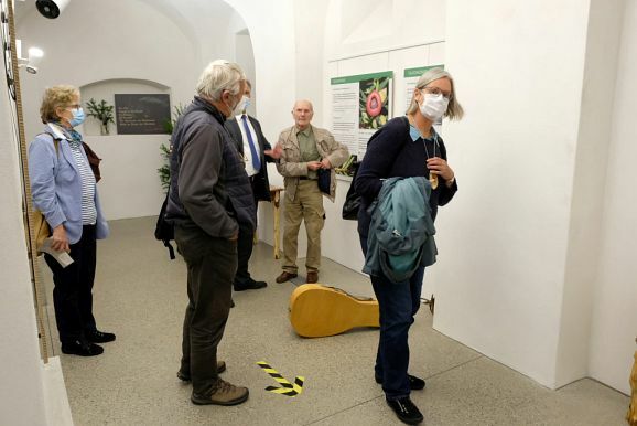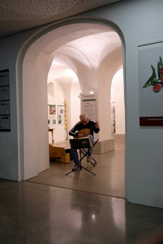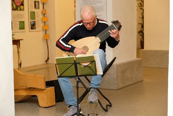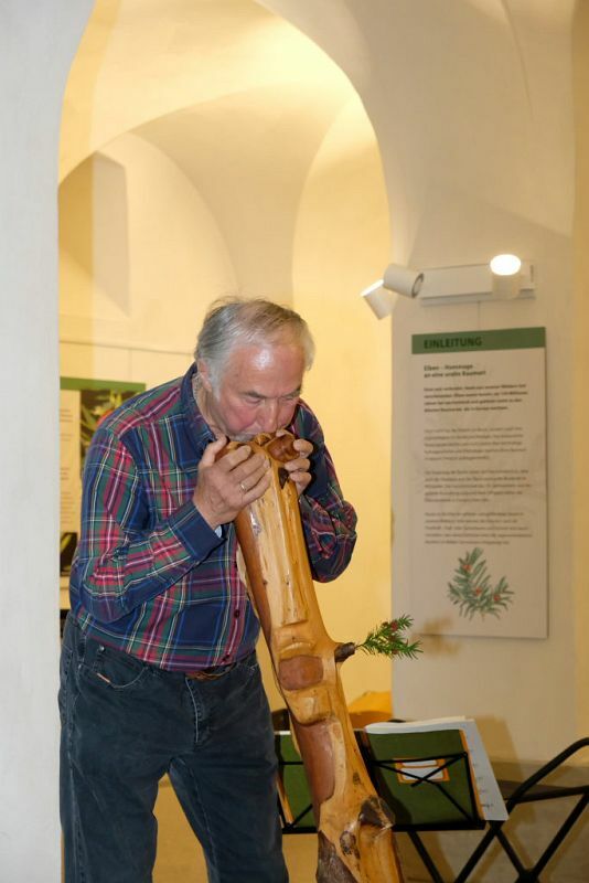 Eiben waren bereits vor 150 Millionen Jahren bei uns heimisch und gehören somit zu Europas ältesten Baumarten. Ihr wertvolles Holz fand schon früh Verwendung als Bogenholz und war wegen seiner hohen Haltbarkeit auch im Wasserbau oder für Musikinstrumente gefragt. Gerade die Laute, ein mittelalterliches Instrument wurde häufig aus dieser Holzart hergestellt. „Und wie der Baum im Wald ist auch das Instrument fast vollständig aus der heutigen Musikszene verschwunden,“ berichtet Ernst Greinacher, der gar mit zweien dieser heute sehr seltenen Instrumente die musikalische Seite der Ausstellungseröffnung bestritt.