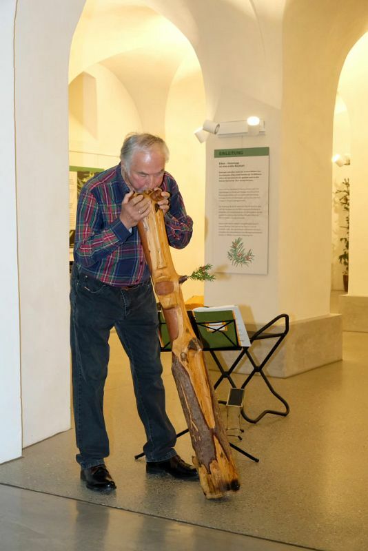 Mit einem urigen „oberschwäbischen Didgeridoo“, natürlich aus Eibenholz, setzte Martin Nägele den musikalischen Schlusspunkt hinter die Ausstellungseröffnung. „Eigentlich müsste es Laute heißen,“ sagte er über sein Instrument.