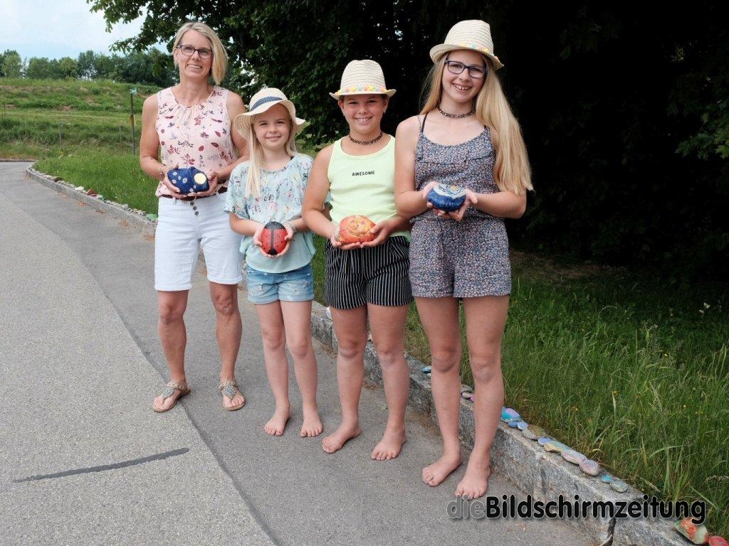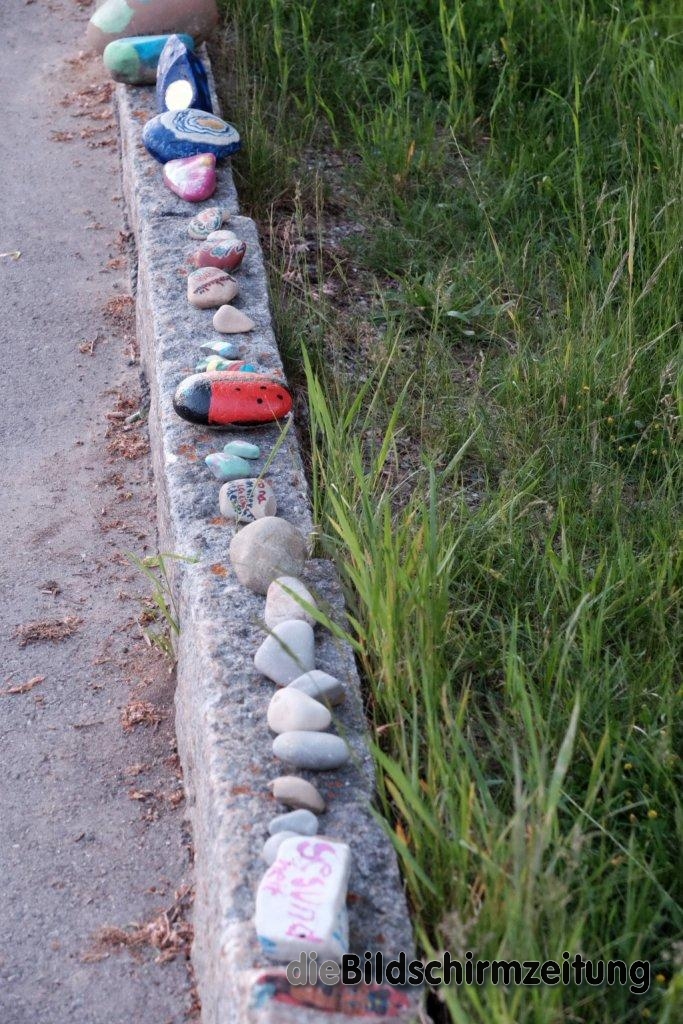 Als Susanne Sauter aus Hauerz ihren Töchtern Lea und Luise Anfang April den Vorschlag für die Aktion unterbreitete, waren diese zunächst nicht sehr interessiert. Aber als absehbar war, dass die Zeit der Trennung von ihren Klassenkameradinnen länger dauern würde, sprang der Funke doch noch über. Sie suchten (und fanden) über einen Aushang viele Mitstreiter. Und so ziert nun eine lange bunte Steinschlange – bei der letzten Zählung der Mädchen waren es schon weit über 200 bemalte Steine – den Randstein gegenüber des Kindergartens und der Festhalle. „Tschüss Corona“ oder „Auf Nimmerwiedersehen“ ist da über das Virus und seine Auswirkungen zu lesen. Oder „Stay at home“, der Satz, der international zum Symbol für die Quarantäne wurde. Aber auch viele farbenfrohe, liebevoll gestaltete und „steingewordene“ Kunstwerke, Bilder von Pferden, Marienkäfern oder Regenbogen, sind an dem Wegesrand bei der Festhalle zu bewundern.