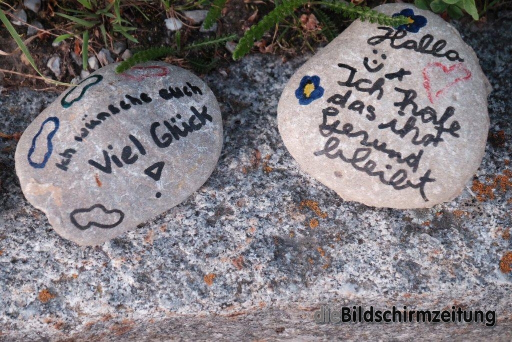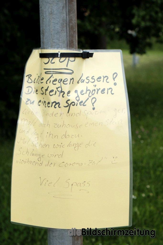 Ein Zettel weist Kinder und Spaziergänger auf die Aktion hin, die Steine bitte liegen zu lassen und auch selbst mit zu machen. Darum ging es Susanne Sauter: „Wir wollten ein Zeichen des Zusammenhaltes setzen.“ Für die Aktion haben die Sauters schon viele positive Rückmeldungen bekommen.