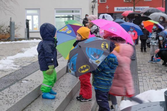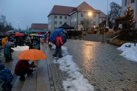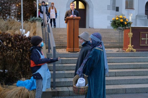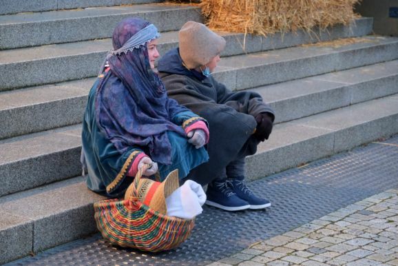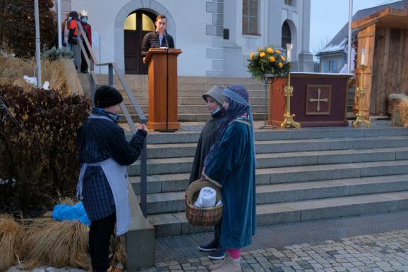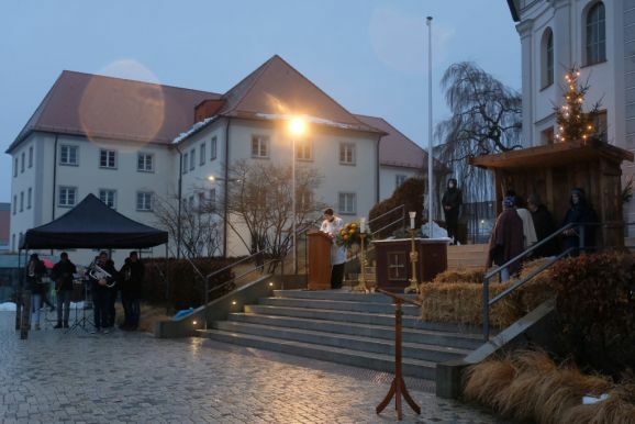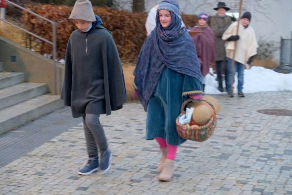 Deutlich zeigten die Akteure auf der Bad Wurzacher Kirchentreppe in den aktualisierten Texten Parallelen zur heutigen Zeit auf: Etwa als der Herbergsvater erfährt dass Maria schwanger ist und plötzlich doch alles ausgebucht ist, wie es vielen Wohnungssuchenden auch heute noch geht. Oder auch, mit welchen Vorurteilen den Hirten damals begegnet wurde, vergleichbar heutigen Hartz IV-Empfängern oder Flüchtlingen.