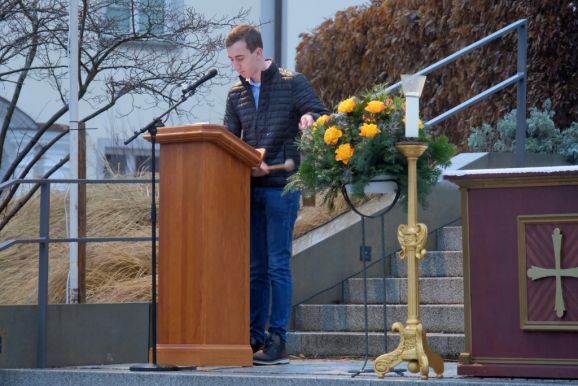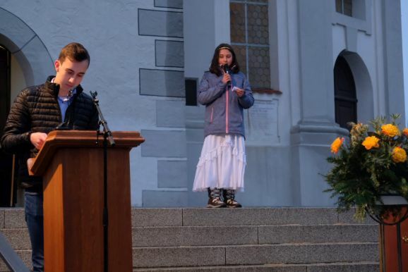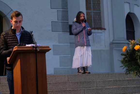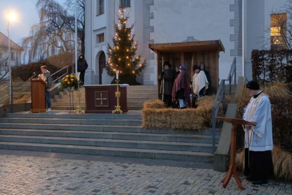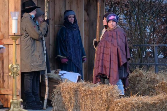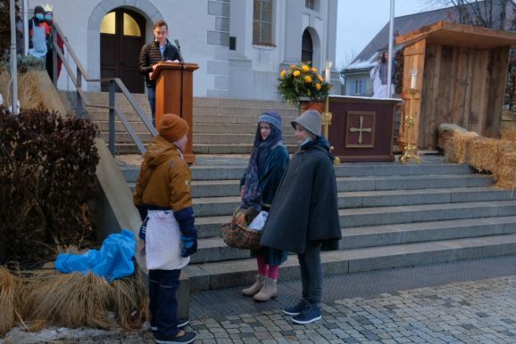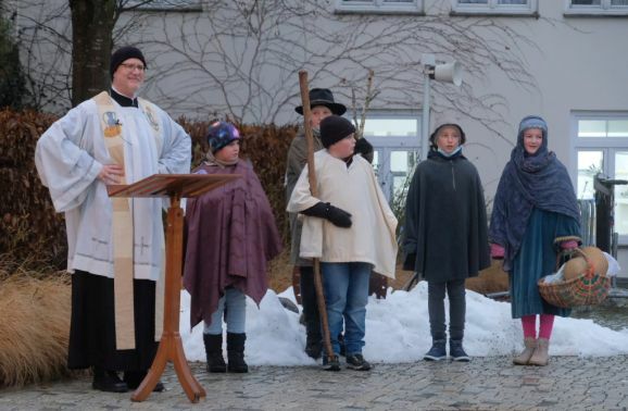 Einer der Gruppenleiter Leon Grösser fungierte bei dem Krippenspiel als Lektor bzw. Erzähler, während Pfarrer Stefan Maier die Besucher des Krippenspieles zum mitmachen animierte. Und so waren alle Familien mittendrin in der Weihnachtsgeschichte.