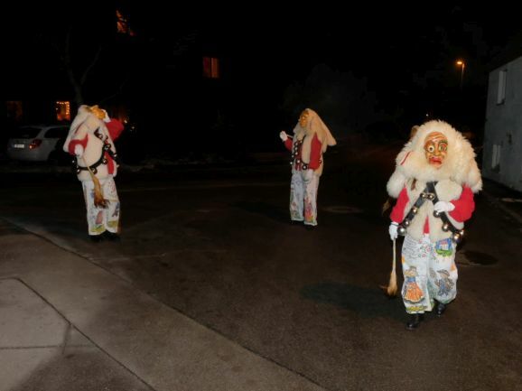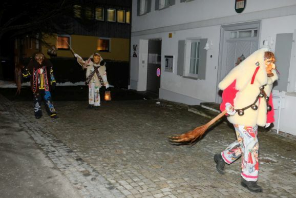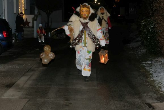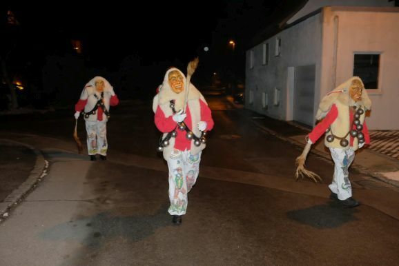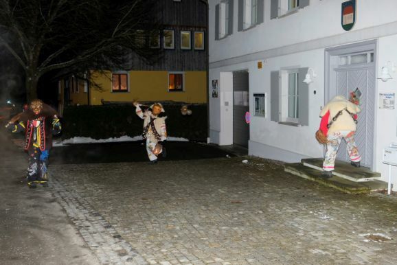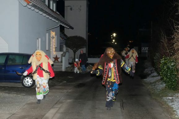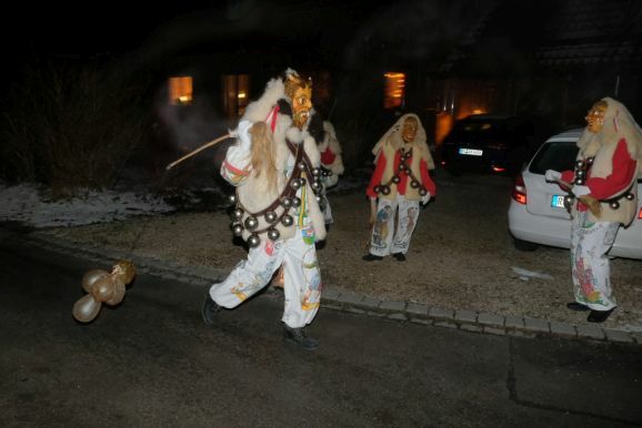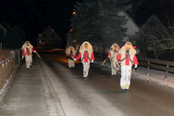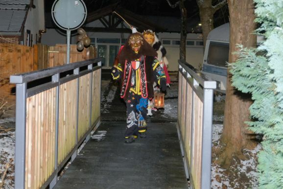 Und so zog die Vorstandschaft als närrisches Dreigestirn mit Daniel Wassner im Häs des Chadaloh, sein Stellvertreter Peter Rösch als Wolfsleib und Kassier Holger Etz im Wago-Häs von der Ehrensberger Straße aus durch die Gassen und Straßen, und das Gschell und die lauten „Wieso Awaa“-Rufe vieler ihrer Hästräger erfüllte die eisigkalte Nachtluf an diesem Abend. Beim Rathaus angekommen versuchte der Zunftmeister zwar noch, durch symbolisches Pochen an die Rathaustüre sich Einlass zu verschaffen, doch die Ortsverwaltung und damit auch das Narrenstüble lag in tiefer Dunkelheit...