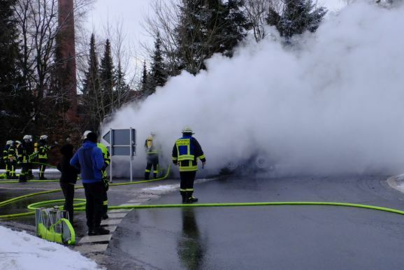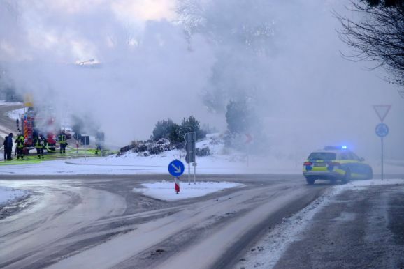 Für den Brand des aus Richtung der Stadt kommenden Lkws verantwortlich war vermutlich auslaufendes Öl oder Dieselkraftstoff, der sich entzündete, denn schon einige hundert Meter vor dem Kreisverkehr konnte auf der noch schneebedeckten Fahrbahn eine regenbogenfarben-schimmernde Spur nachgewiesen werden.