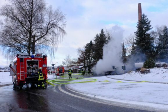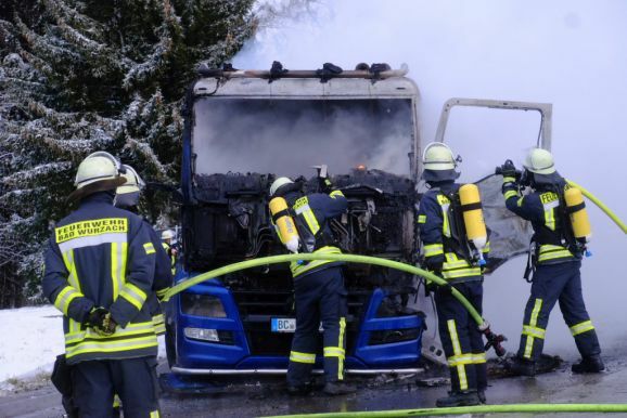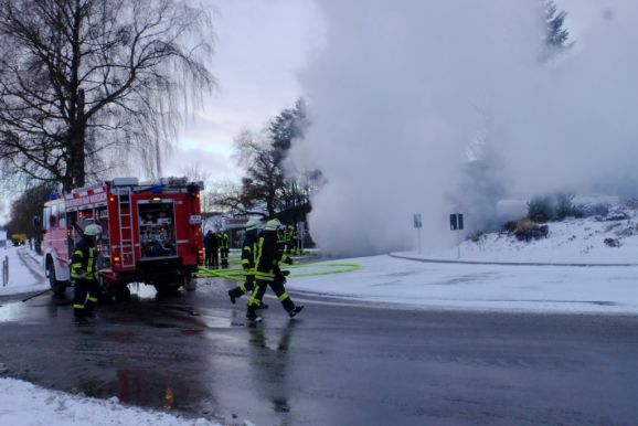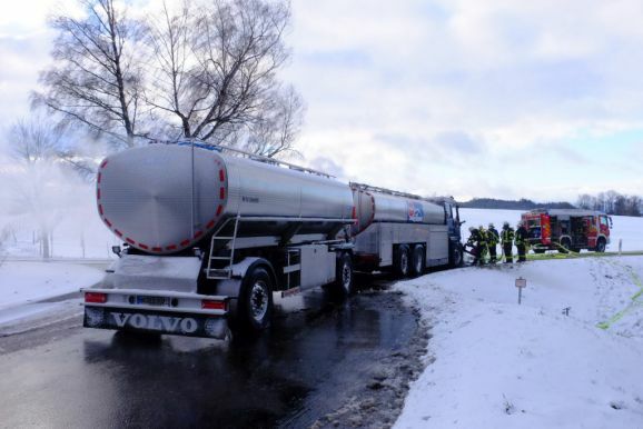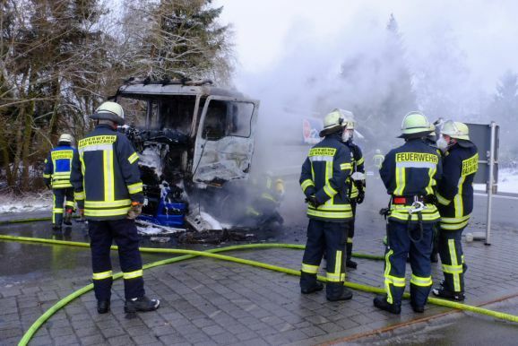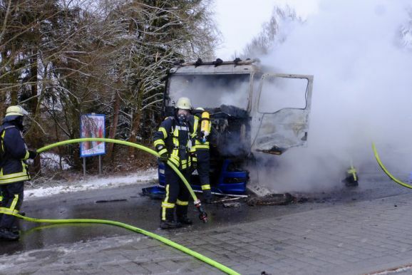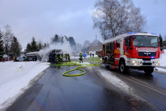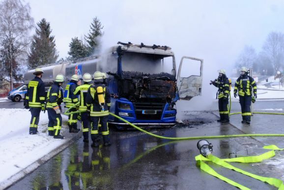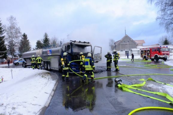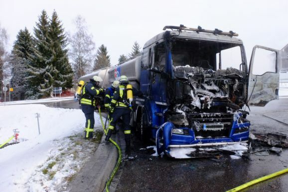 Nachdem die Feuerwehr mit sechs Fahrzeugen die nur rund 300 Meter lange Anfahrt zum Brandort zurückgelegt hatte, bot sich den Feuerwehrleuten folgendes Bild: Die Besatzung des Milchlasters hatte das bereits in Flammen stehende Fahrzeug unverletzt verlassen können, Motor- und Fahrerkabine des Lkw´s standen in Vollbrand.