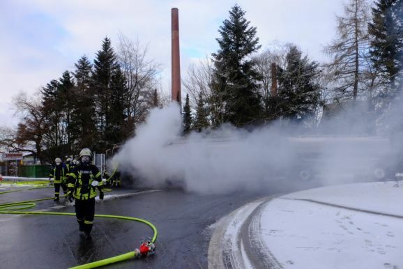 Nach einem ersten Löschangriff konnten die Flammen unter Kontrolle gebracht werden, dennoch war das Fahrzeug noch einige Zeit in eine weiße Rauchsäule gehüllt. Mittels zahlreicher Schlauchleitungen rund um den Kreisverkehr konnte ein Übergreifen auf die Ladung von Lkw und Hänger verhindert werden.