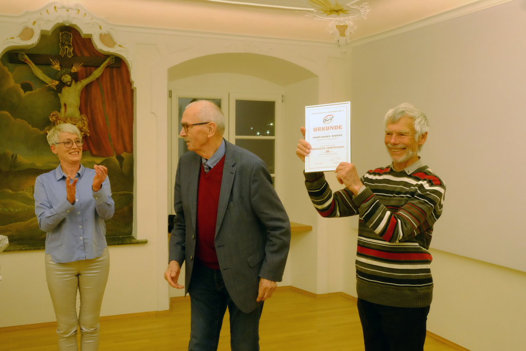 Harmoniemensch und Tenor Jochen Martiny wurde für 20 Jahre Mitgliedschaft ausgezeichnet. Gehring hob seine Verdienste um die Kooperation mit dem Chor in der französischen Partnerstadt hervor.