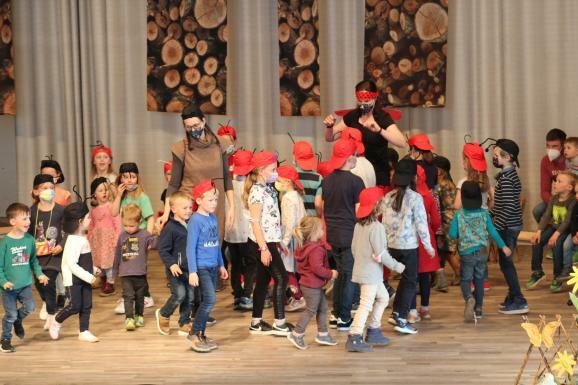 Mit zarteren Tönen sorgten die beiden Querflöten gespielt von Maria Goldhofer und Sabine Wächter, die als Schmetterlinge „Bunt-Auge“ und „Bunt-Punkt“ für ein ruhigere Grundstimmung, wobei die Kinder munter durch die Gegend flatterten.