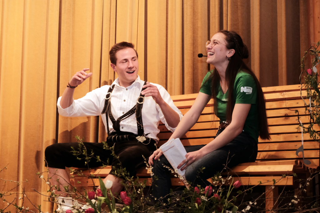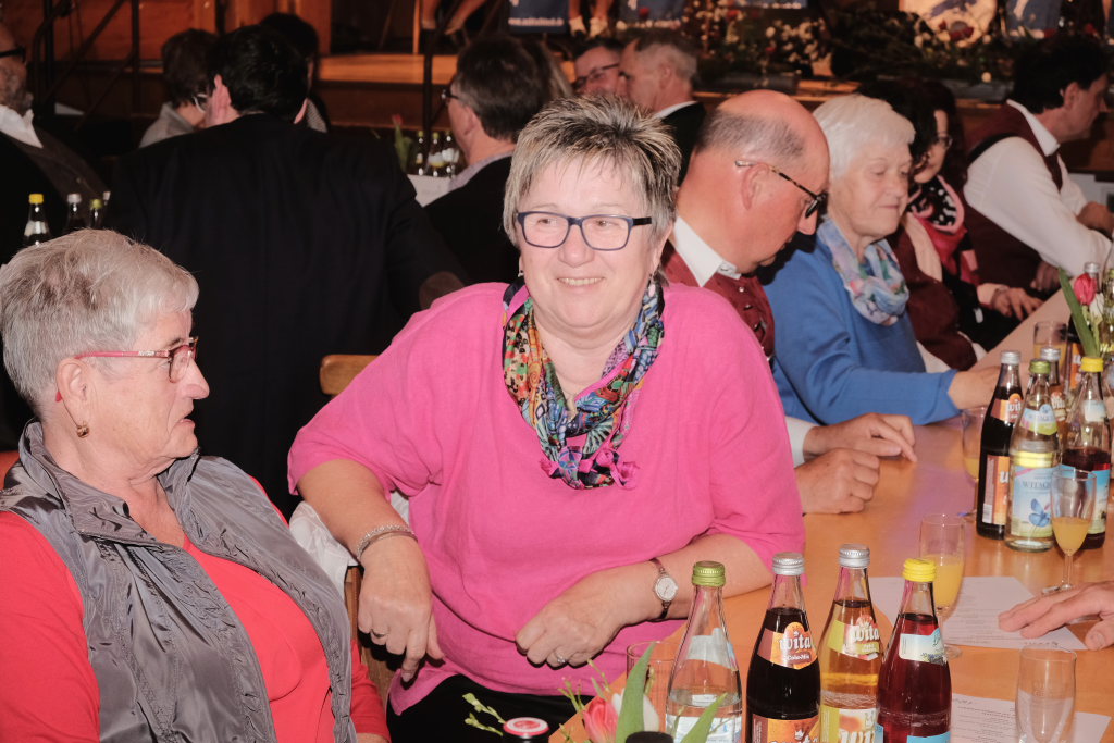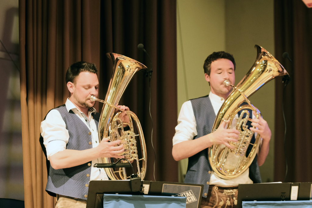 Interessante Details und Geschichten aus der 100+2 jährigen Historie des Musikvereines förderten die aktiven Musiker Heike Reichle und Oswin Butscher in einem Sketsch zutage. Butscher hatte ja wegen Corona viel Zeit sich mit der Chronik des Vereins zu befassen. Der erste Dirigent stammte aus Baienfurt, geprobt wurde anfangs in Roßberg (!). Dass die Uniformen, welche die Ziegelbacher Musikanten im Laufe der Jahrzehnte trugen, nicht immer „geschmacksicher“ waren, zeigte eine kleine Abordnung der Kapelle bei ihren musikalischen Intermezzi, wo sie diese zur Schau stellten, sehr zum Amüsement der beiden „Chronisten“. Aber darüberhinaus berichteten Sie auch von allerlei anderem: Etwa dass schon mal heftigst gestritten wurde, aber bis zur nächsten Musikprobe alles wieder vergessen wurde. Dass die Ziegelbacher bereits bei ihrem ersten Wertungsspiel 1961 mit einer damals „neuartigen Amerikanischen Ouverture“ den ersten Platz belegten. Dass unter den Musikern kluge und erfinderische Köpfe dabei waren: Einer erfand eine mathematische Formel, die bis heute noch nicht widerlegt werden konnte, ein anderer fürs Bockbierfest die Trompetenorgel.