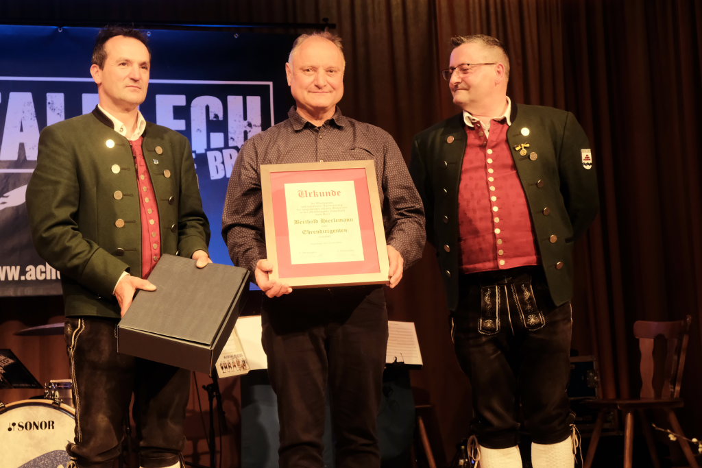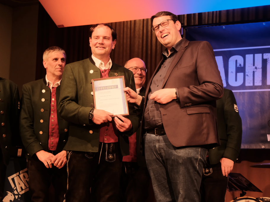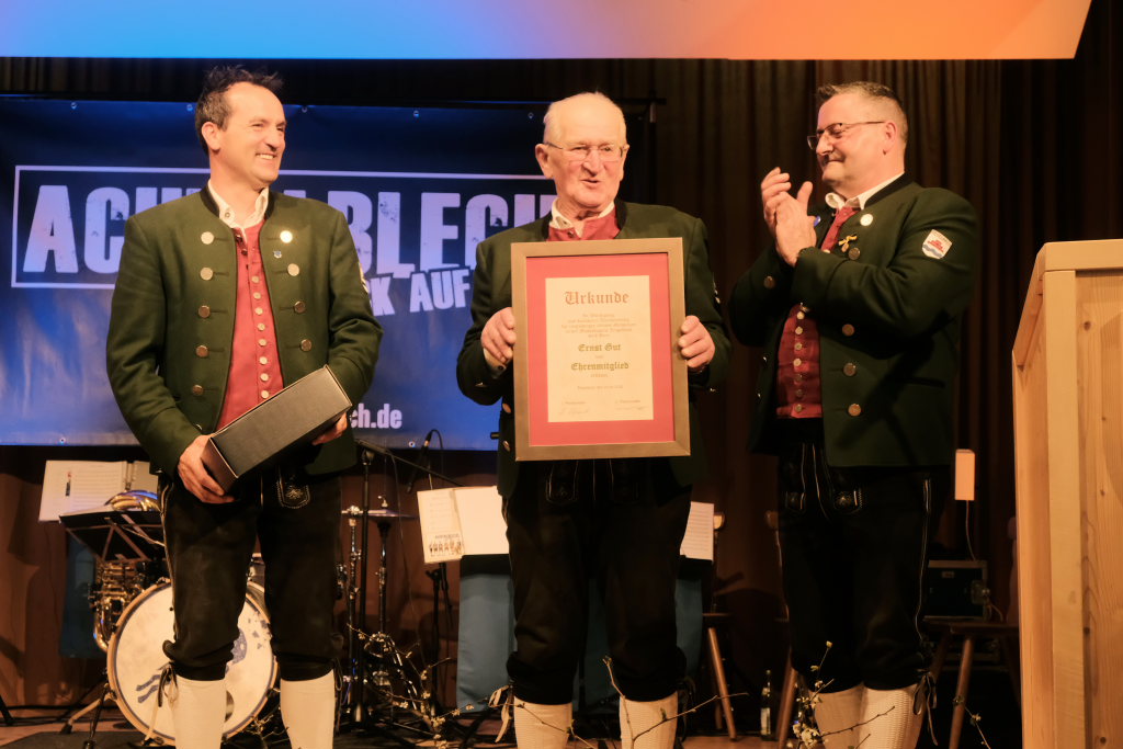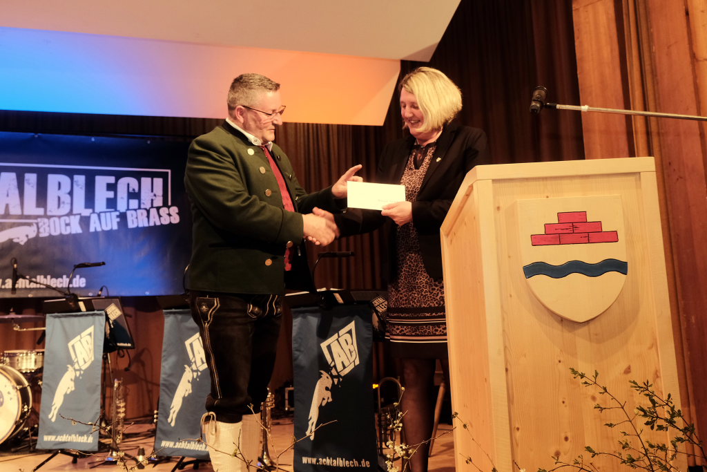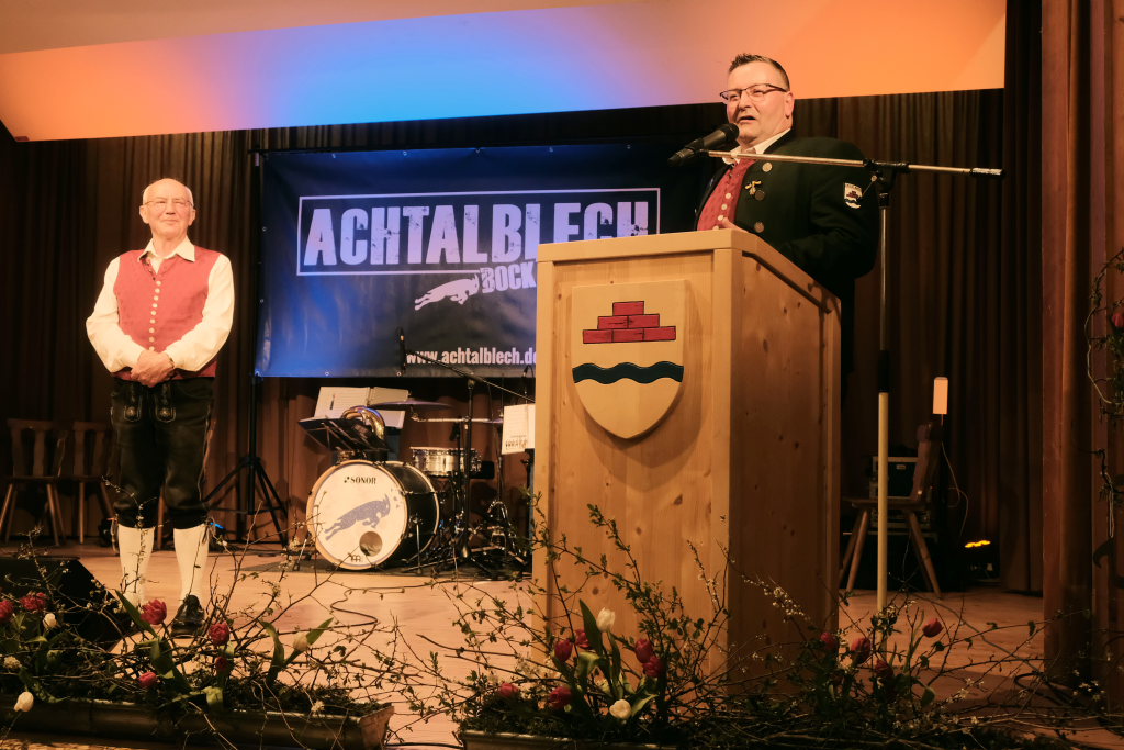 Der Kreisverbandsvorsitzende Rudi Hämmerle sagte, ehe er zu den Ehrungen langjähriger Musiker schritt, dass in der Zeit viele Kapellen gegründet wurden. Und an Bürgermeisterin Scherer gewandt: „Es sind große Fußstapfen, die Ihnen ihr Vorgänger hinterlassen hat, denn während seiner Amtszeit fanden fünf Kreisverbandsmusikfeste statt.“ Er persönlich sei deswegen froh dass sie in Bad Wurzach bleibe. Denn die Bad Wurzacher Jugendmusikschule habe schon eine besondere Stellung im Kreis. „Und sie ist mitverantwortlich für die die großen Erfolge in den Dörfern.“ Er sagte mit Blick auf den Ortsvorsteher:„Wählet den Ma, er hot alles richtig g´macht: Er ist Ortsvorsteher, macht aktiv Musik und er hot a Ravensburgere g´heiroted.“ Zum Vorstand Freddy Holzmüller sagte er: „So oin sott ma klona.“