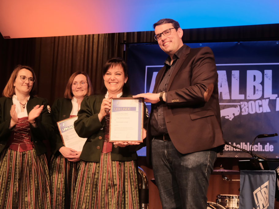 „Im Reich der Töne erblühet das Schöne“ mit diesem Motto der 13 Gründungsväter, das auch die Fahne des Musikvereines Ziegelbach ziert, begrüßte Vorstand Freddy Holzmüller die Gäste zum Festabend anlässlich des 100jährigen Jubiläums der Musikkapelle, das nun mit zwei Jahren Verspätung endlich gefeiert werden konnte. Neben zahlreichen Ehrenmitgliedern und Vertretern der Ziegelbacher Vereine konnte der Vorstand auch Bürgermeisterin Alexandra Scherer, Ortsvorsteher Alfons Reichle sowie Pfarrer Patrick Meschenmoser begrüßen.