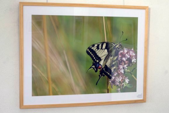 Valerie Forster nimmt normalerweise die Rolle der stillen Beobachterin ein. Um den Gästen ihre Arbeit näherzubringen, erzählte sie die Geschichte des ausgestellten Bildes „Die Notlandung des Schwalbenschwanzes“. An einem sonnigen, aber windigen Tag landete auf der Terrasse ein Schwalbenschwanz, vermutlich um sich vor dem Wind zu schützen auf dem Pflaster der Terrasse. „Und da saß er, ganz still, die Flügel weit geöffnet und wunderschön.“ Nur das Pflaster störte die Idylle.