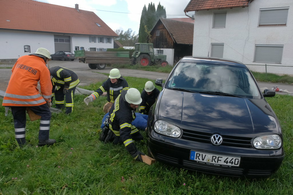 Eintürnen - Kommandant Alfons Riether, Gruppenführerin Patricia Leiprecht und Gruppenführer Gerd Leiprecht, das Führungsteam der Feuerwehrabteilung Eintürnen probte mit ihren Feuerwehrmännern vor zahlreichen Zuschauern den Ernstfall, nach einem Szenario, das ihnen Jochen Neubauer von der Feuerwehr Bad Wurzach Stadt entworfen hatte.