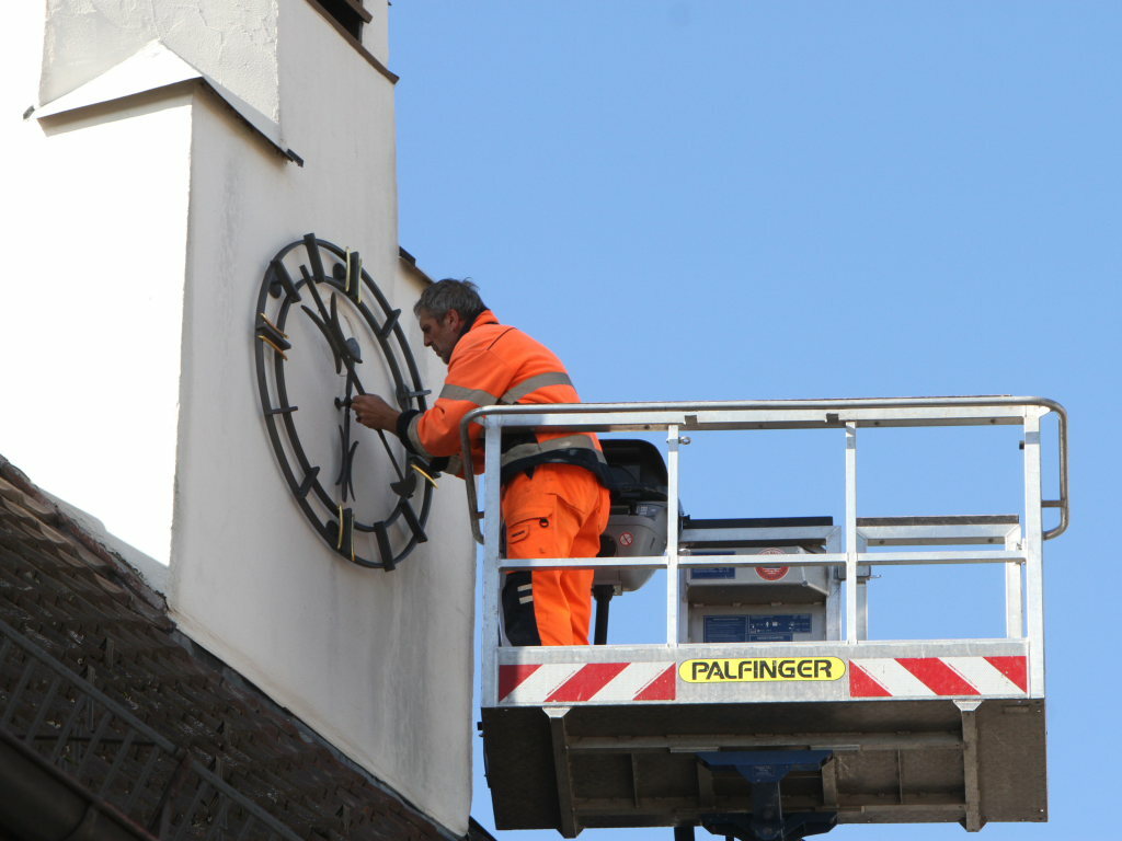 Bad Wurzach - Mittels einer Hebebühne befestigte Hubert Reichle vom städtischen Bauhof – angeleitet von Uhrmachermeisterin Svenja Brauchle aus dem Inneren des Rathaustürmchens die Zeiger der Rathausuhr wieder dorthin, wo sie hingehören.