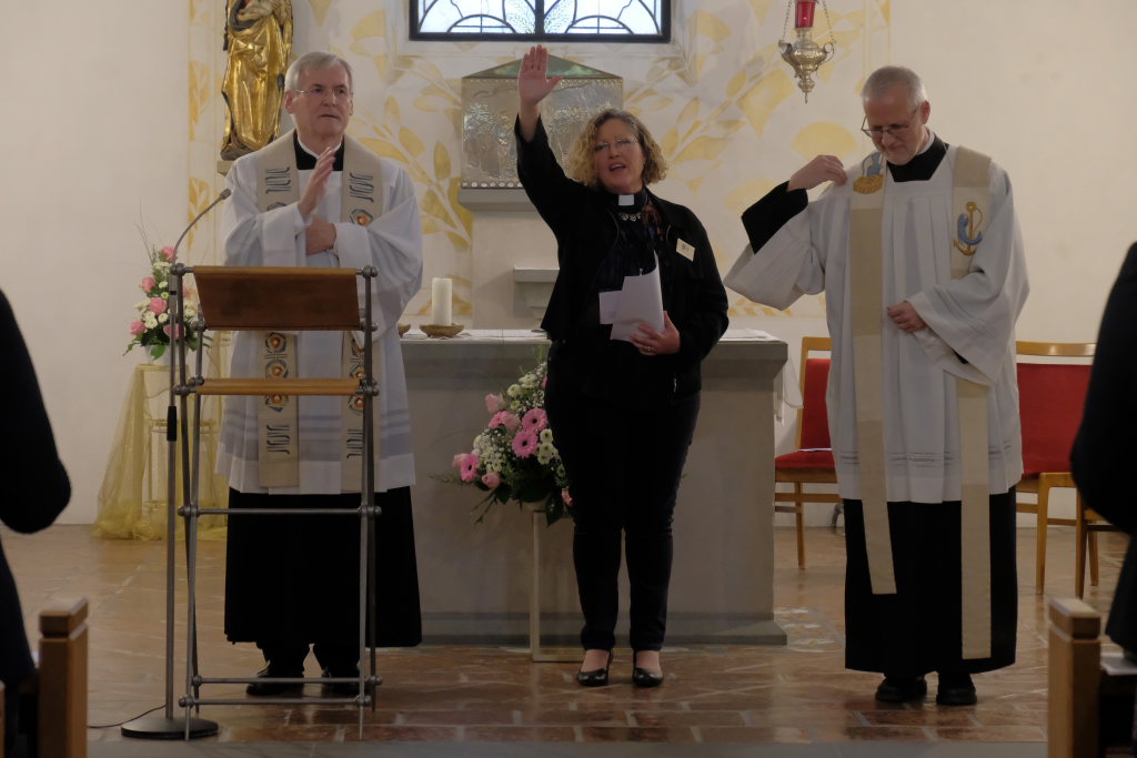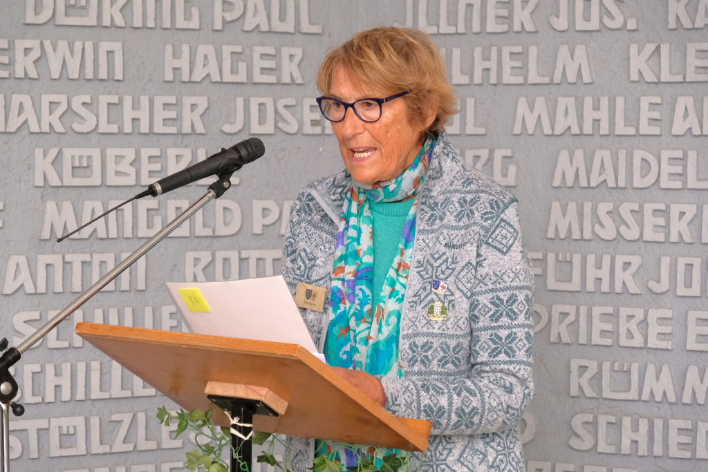 Bad Wurzach - Nach dem Gedenkgottesdienst in der Schlosskapelle führte der Weg der Delegation aus Jersey und seiner Bad Wurzacher Gastgeber hinauf zum Friedhof, um an der Aussegnungshalle mit einer Kranzniederlegung und Gedichten der verstorbenen Internierten zu gedenken.