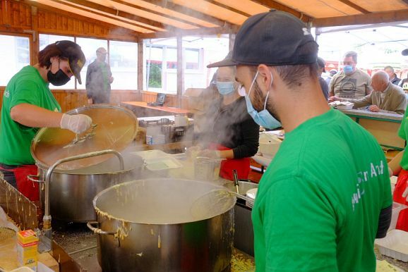 Arnach - Auch wenn in diesem Jahr das Stadtfest Bad Wurzach erneut abgesagt werden musste, auf die Arnacher Kässpatzen des Musikverein Arnach – alljährlich eines der lukullischen Highlights des Stadtfestes – musste in diesem Jahr niemand verzichten: Samstag und Sonntag hobelten und kochten rund 20 Mitglieder des Vereines auf dem Schulhof der Arnacher Schule an diesem Stadtfestwochenende die Arnacher Spezialität – auch „To Go“.