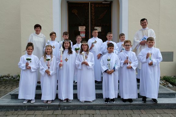 Bad Wurzach - Mit zwei Gottesdiensten, in der Pfarrkirche St. Ulrich und Margaretha zelebriert von Pater Mariusz, feierten 13 Kommunionkinder – fünf Mädchen und acht Jungen – nach langer Vorbereitungszeit mit Gemeindereferentin Angelika Schupp und Pastoralreferent Michael Maier unter dem Leitwort „Vertrau mir, ich bin da!“ ihre erste Heilige Kommunion.